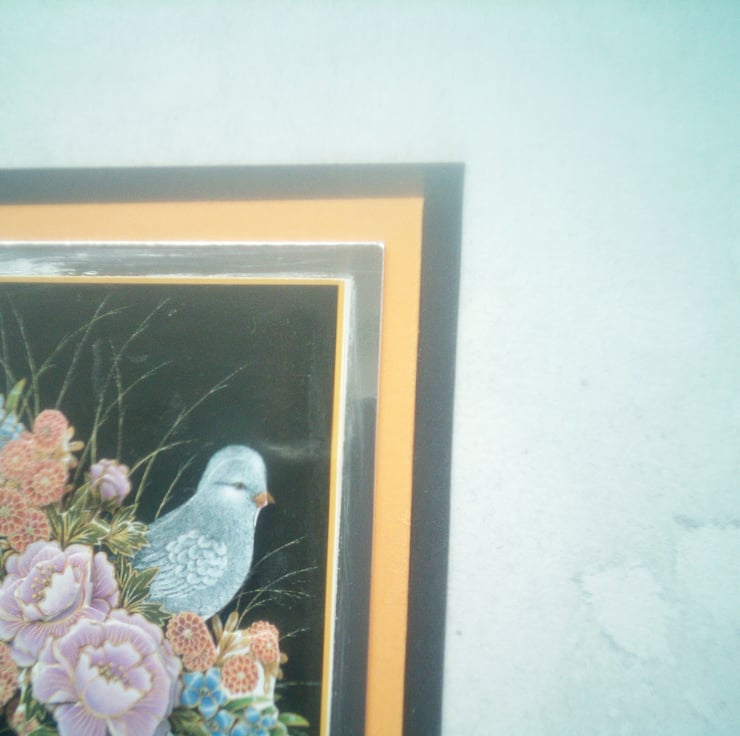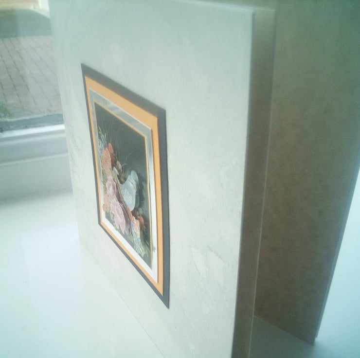 A completely handmade and uniquely designed card. Consisting of a dove among flowers decoupage mounted onto silver mirri, orange, black, mottled card and finally onto pristine white quality card.