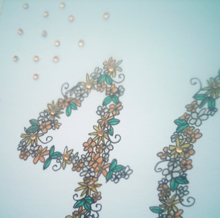 A completely handmade and uniquely designed card. Consisting of 40 hand drawn in floral design. Hand coloured. Finished off with gold rhinestones
