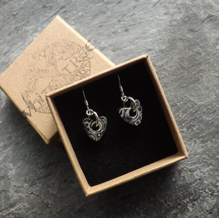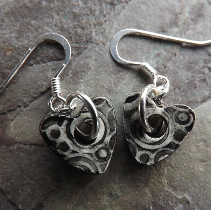 These hearts have a pattern stamped into the wet clay, reminiscent of ripples on water. I have then added a soft wash of black. These earrings are from a range of coordinating colourful heart-shaped accessories. As with all my jewellery they are made and decorated entirely by hand.