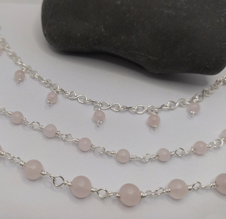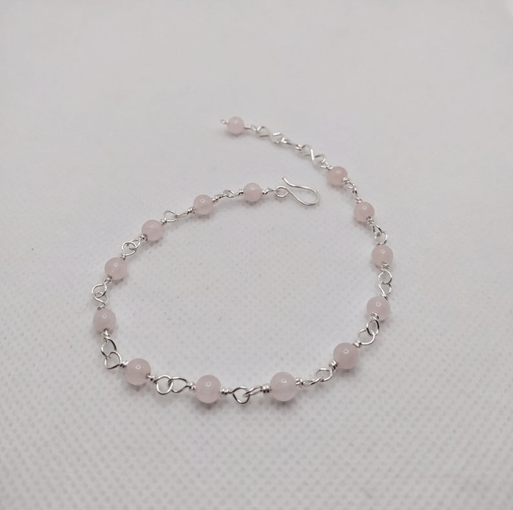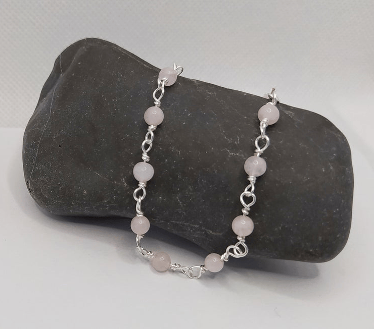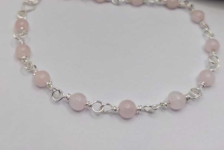 A bracelet made of 4 mm rose quartz beads, hand wrapped in 0.6 mm silver filled copper wire.