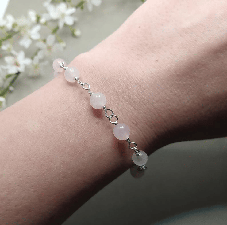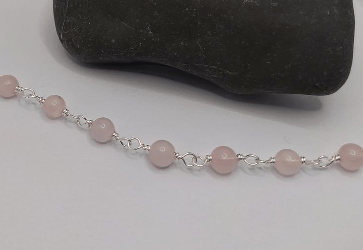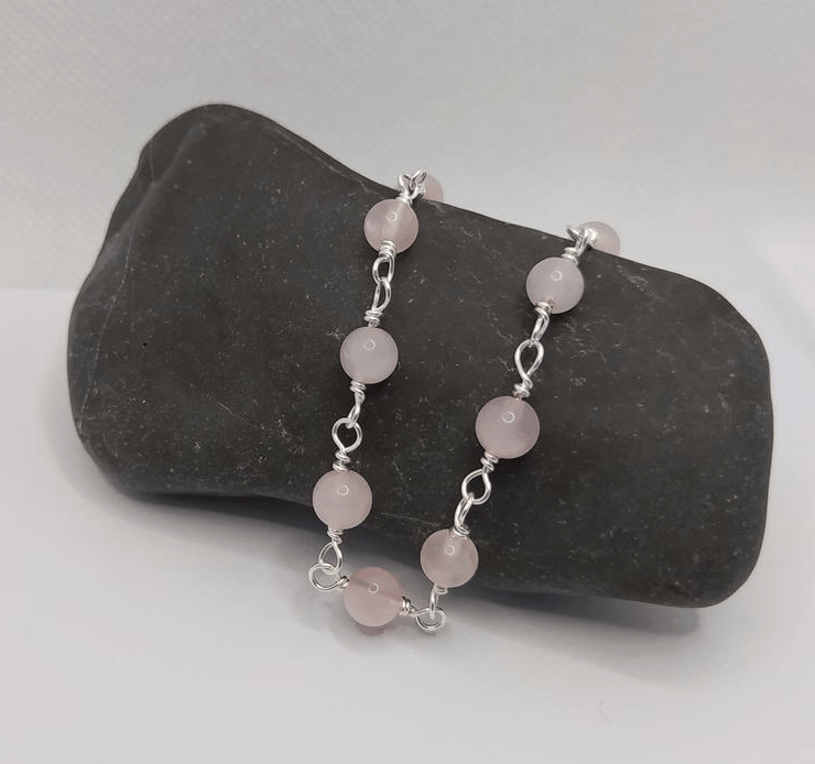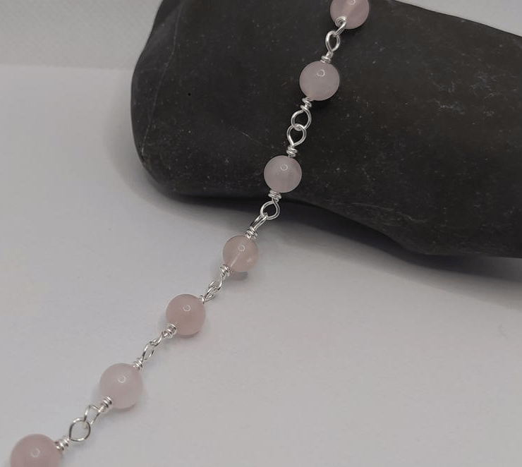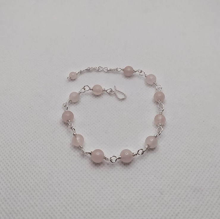 A bracelet made of 6 mm rose quartz beads, hand wrapped in 0.6 mm silver filled copper wire.