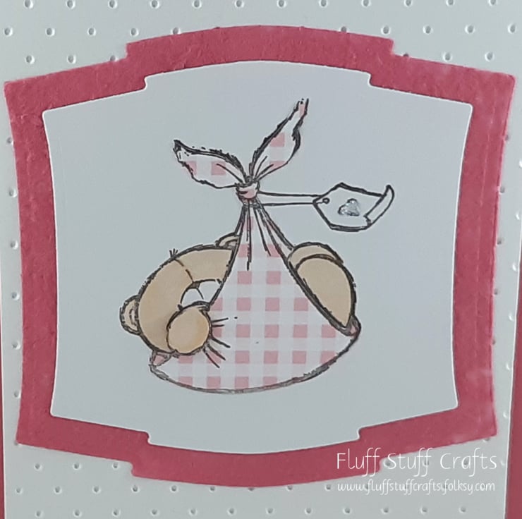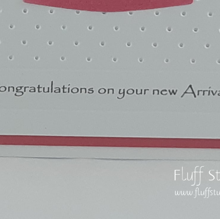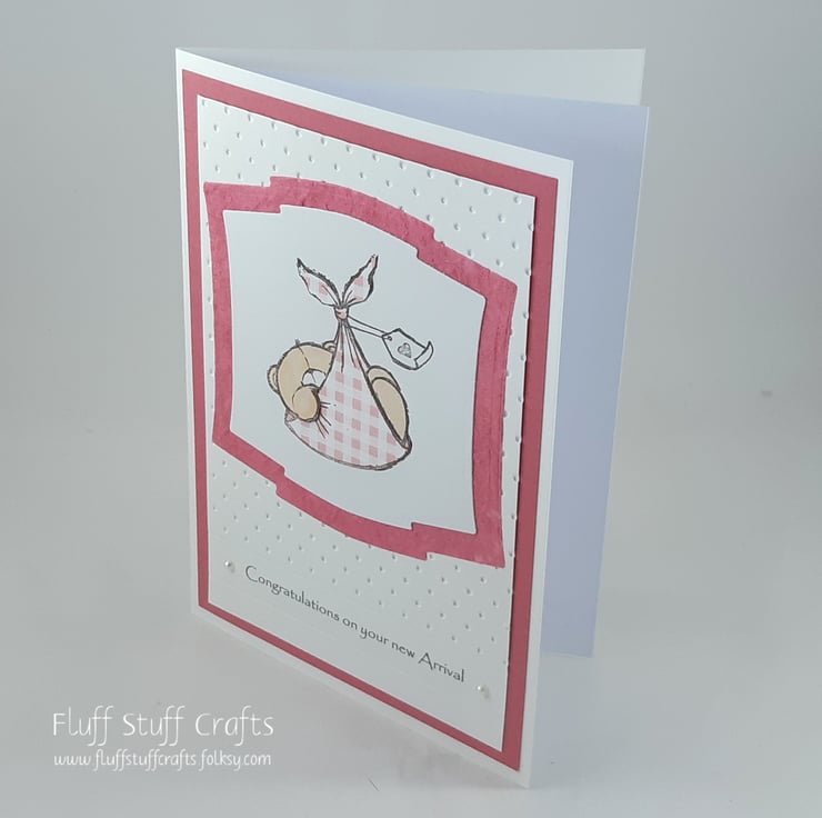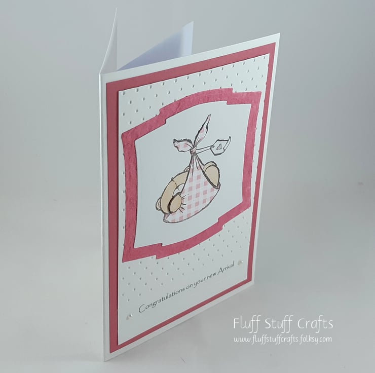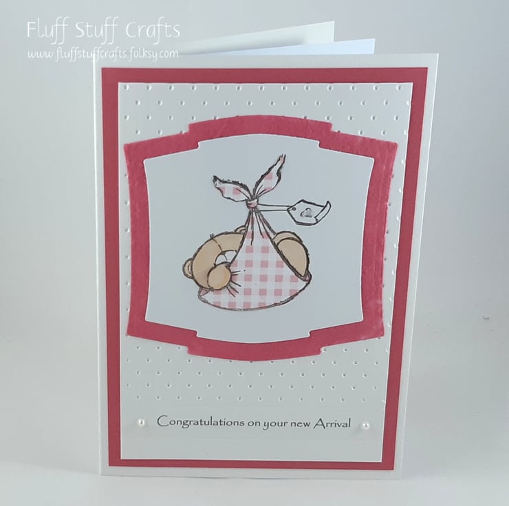 A6 new baby card featuring a cute Forever Friends bear wrapped up in a pink gingham blanket. The image has been framed in pink card, over a white, embossed background, mounted onto another pink card. The printed sentiment reads: 'Congratulations on your new Arrival' and is embellished with two small adhesive pearls.
