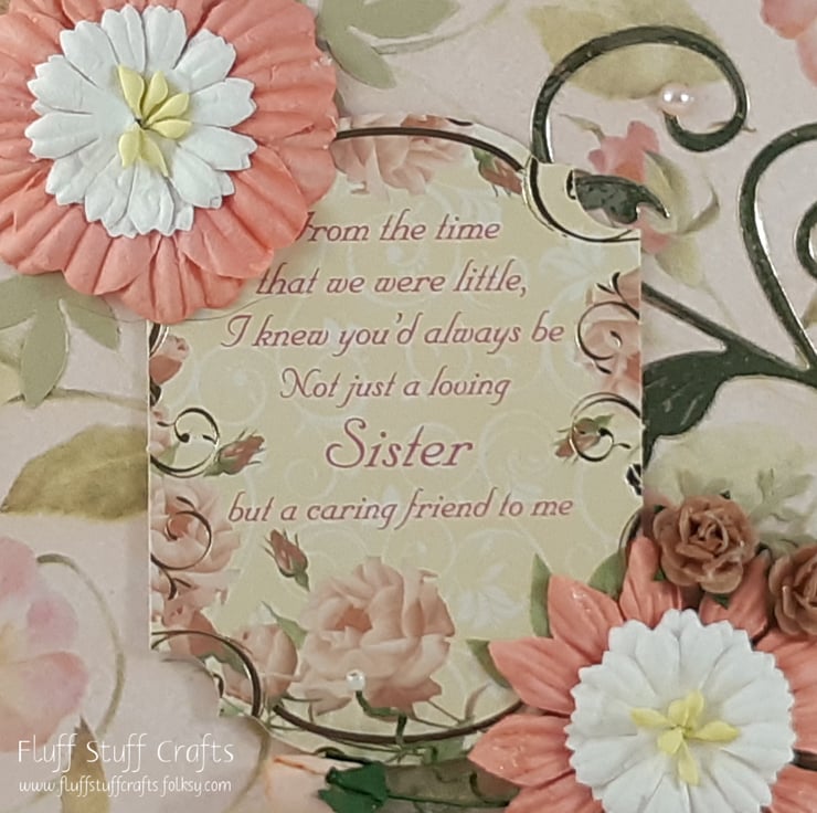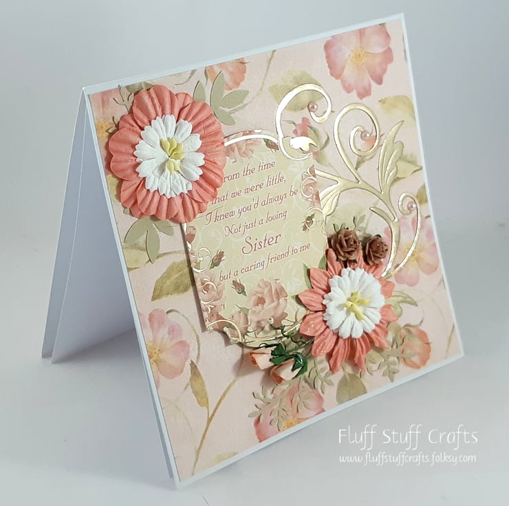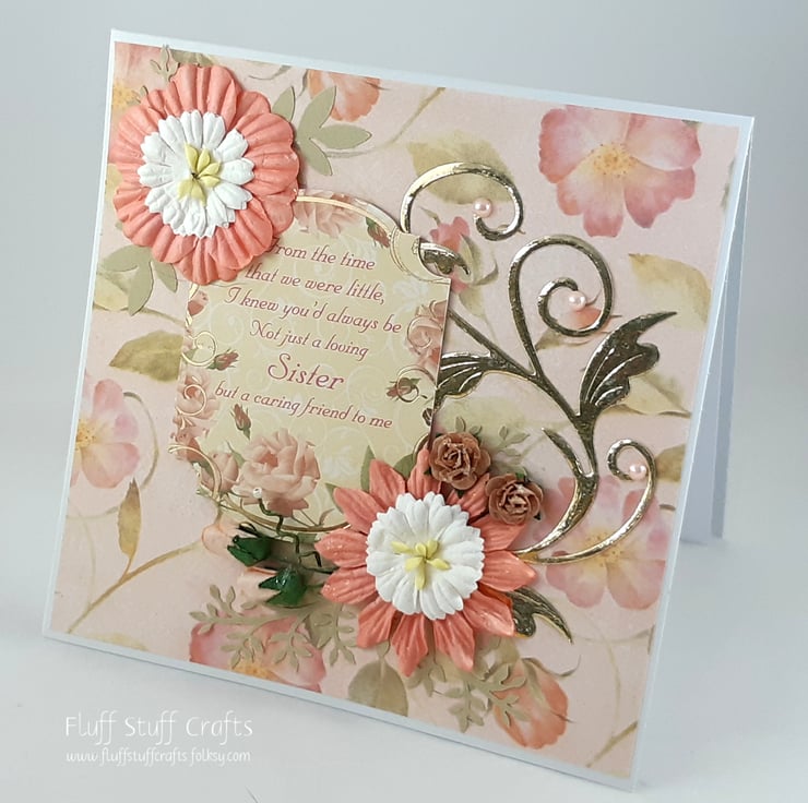 The panel is overlaid onto pink floral paper and embellished with die cut leaves, gold swirls and paper flowers. The insert has been left blank for your own message, depending on the occasion.