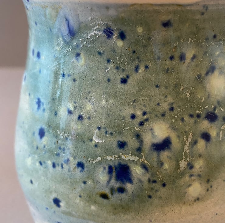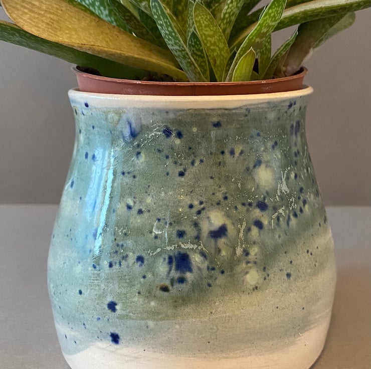 Decorated with a generous sweep of turquoise green speckled glaze. Deep blue speckles feature. Areas of thicker and thinner glaze are applied, making this a tactile pot. Hide your brown plastic tubs in here for a planter, storage or decorative.