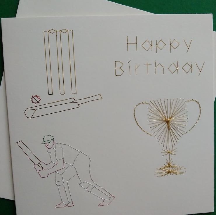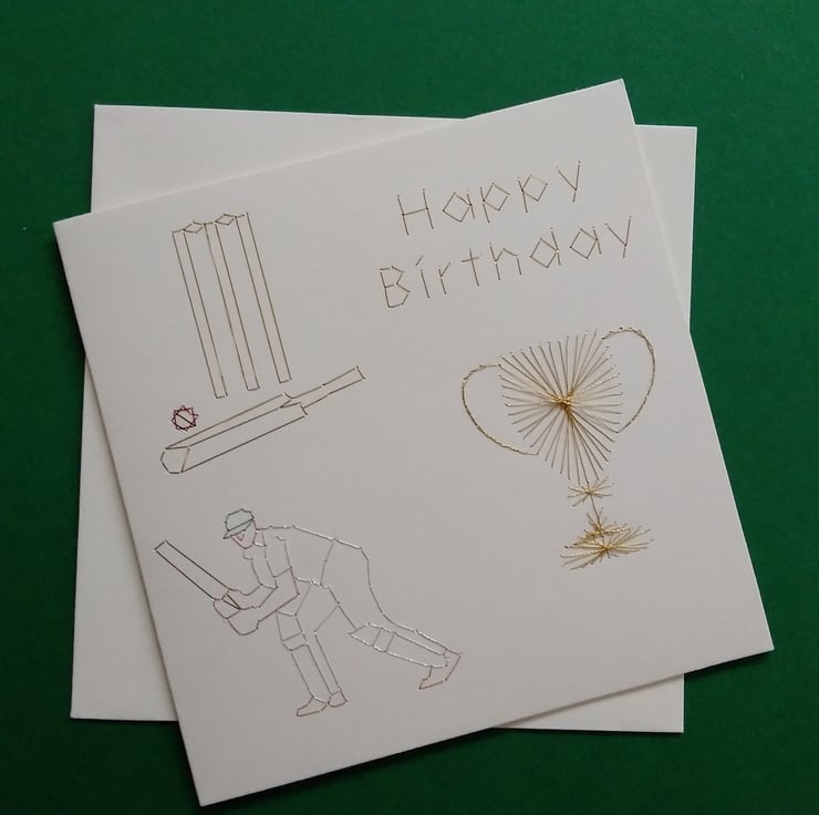 An ideal card for the cricket player or enthusiast featuring a cricket bat, ball and stumps,a cricketer and a gold cup. Hand embroidered in red, pink, green, gold and silver metallic thread on a cream card. The ivory insert has been left blank for your own message.