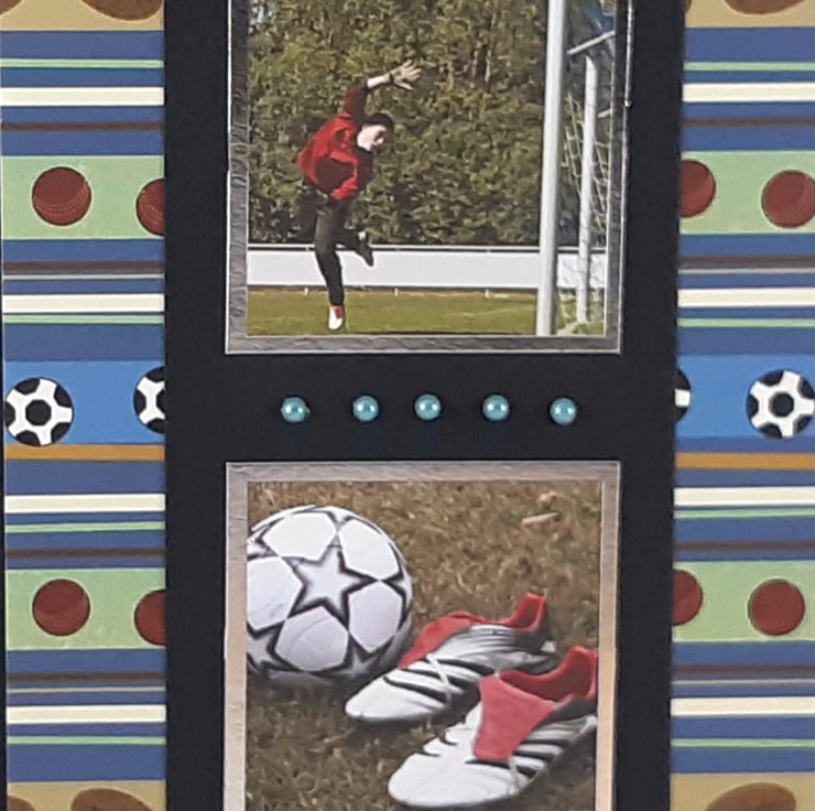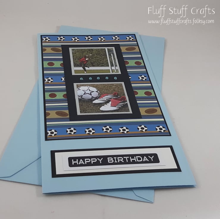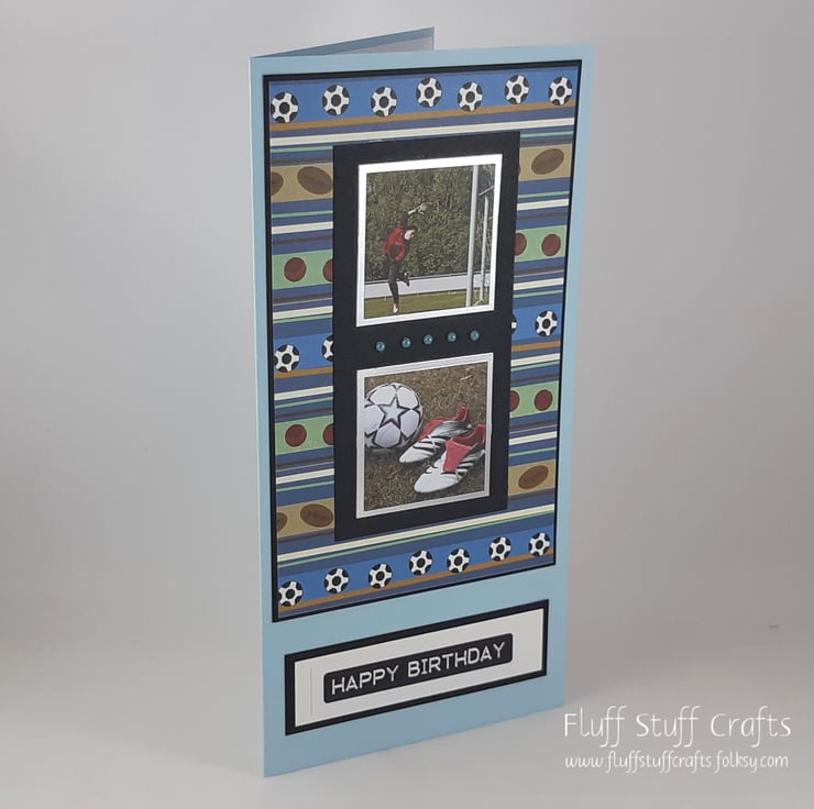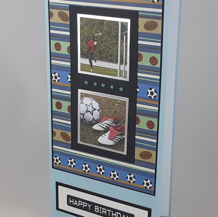 Tall birthday card featuring two football themed images. They have been mounted onto black card over a background of footballs, rugby balls and cricket balls. The sentiment reads: 'Happy Birthday'. The insert is left blank for your own personal message.