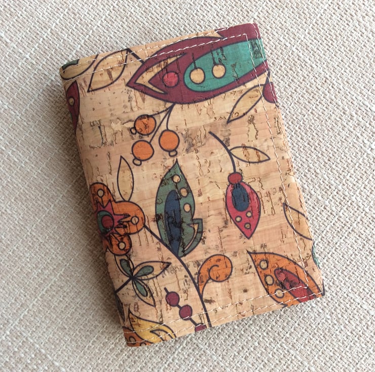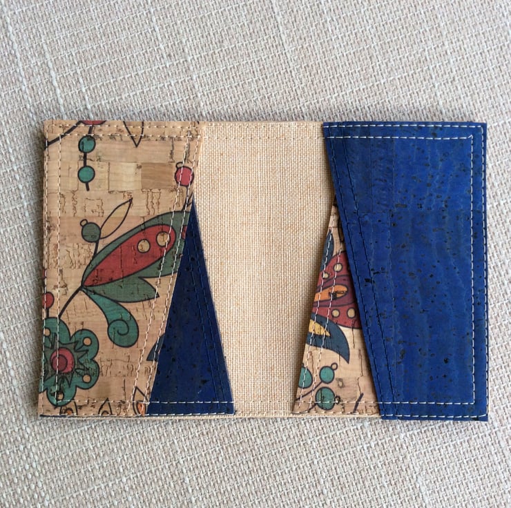 A card holder, or small wallet, hand made from natural cork fabric. The simple folding design is handy for cards or notes and small enough for any pocket . The outside is natural cork with Amazon flowers print and the asymmetrical pockets are in the same fabric with contrasting dark denim blue.