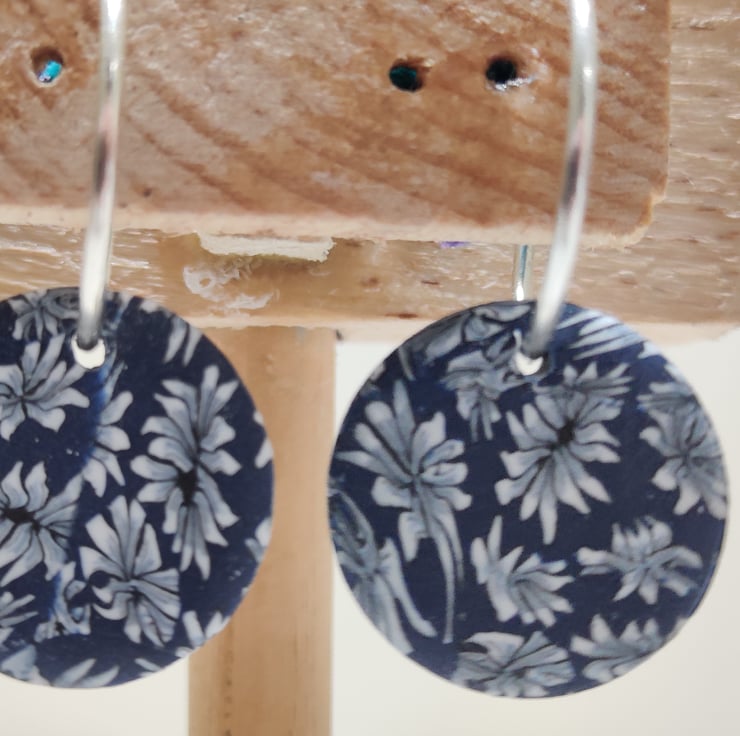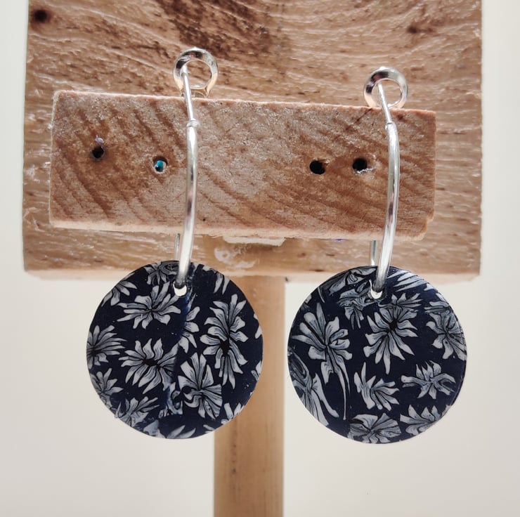 Hand made polymer clay earrings with a floral pattern Medium- sized. Threaded through a silver colour hoop. Hook fixing which can be painted with hypoallergenic coating on request for free but may negativity impact on the finished look.. Please see all photos for close up detail. All products handmade therefore there may be minor imperfections. Each pair sold as seen, message for more