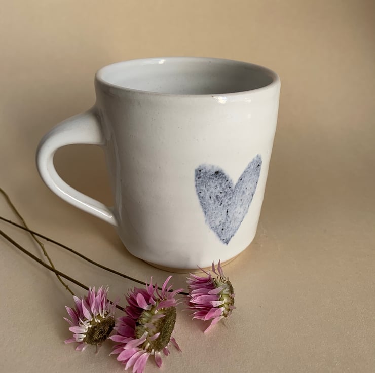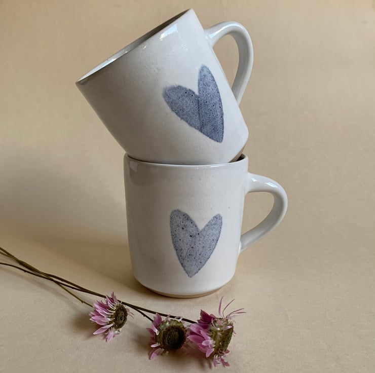 These mugs are all thrown on the potters wheel. Once I have thrown a large batch they are left to dry until they become "leather hard". I then trim them to tidy the base and refine the body shape. At this stage I add the handles and then I use a hand cut newspaper stencil to add a decorative heart to the mug. I use a blue slip (this is a liquid clay with stains or oxides added which creates the colour) to paint the heart. The mugs now have their first firing to change them from clay to ceramic. After this initial firing they are dipped in a shiny white glaze. They are now fired again to a temperature of 1270 degrees c. This vitrifies the glaze, making the mugs water tight, strong and durable.