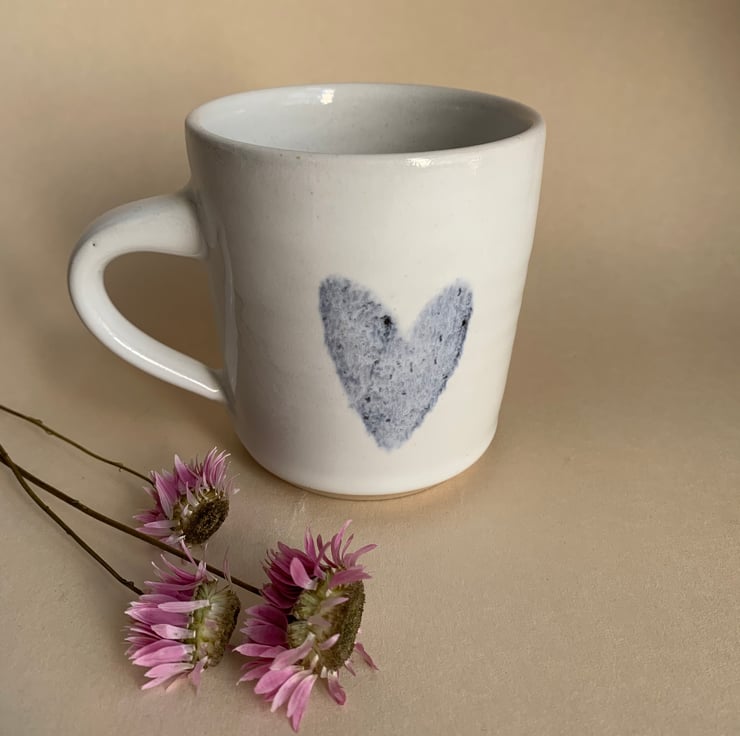 White Mug with Pale Blue Heart decoration, Handmade tea cup or coffee mug