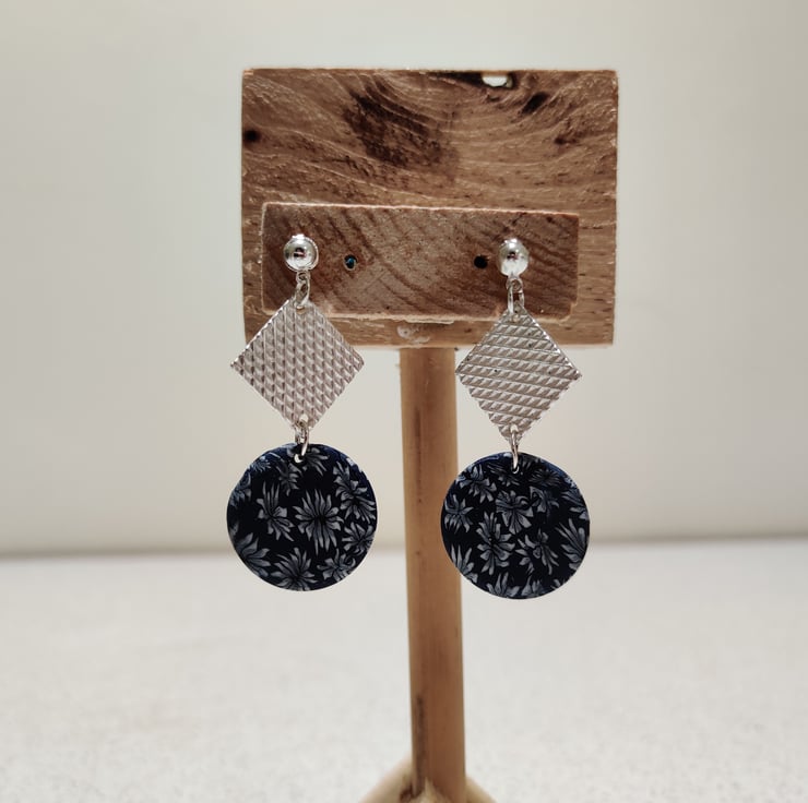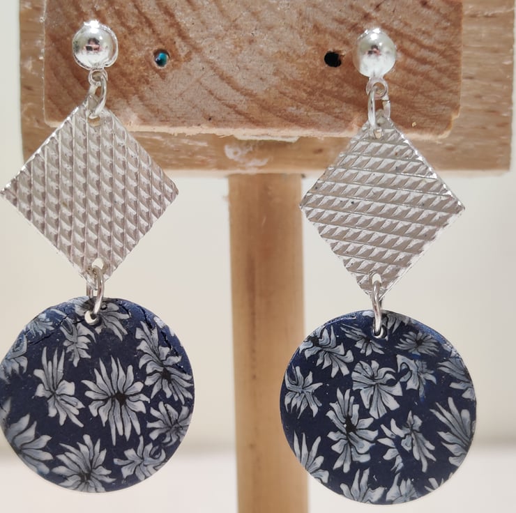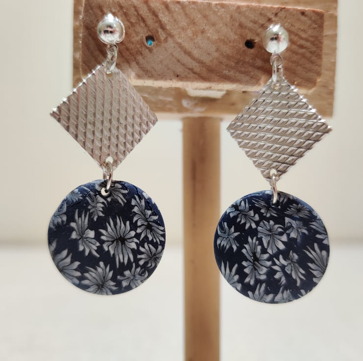 Hand made polymer clay earrings with a floral pattern, silver colour embellishment and silver colour stud. Stud fixing which can be painted with hypoallergenic coating on request.. Please see all photos for close up detail. All products handmade therefore there may be minor imperfections. Each pair sold as seen, message for more