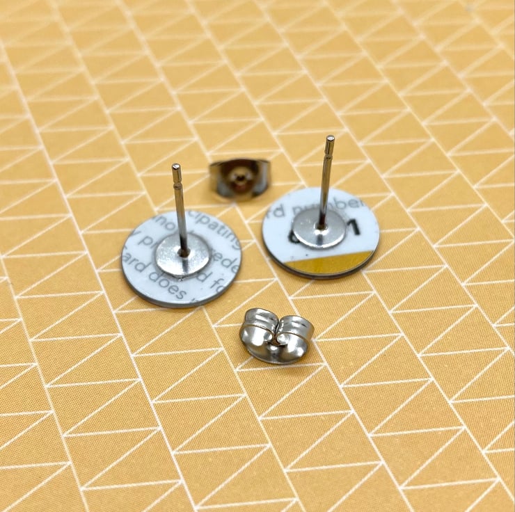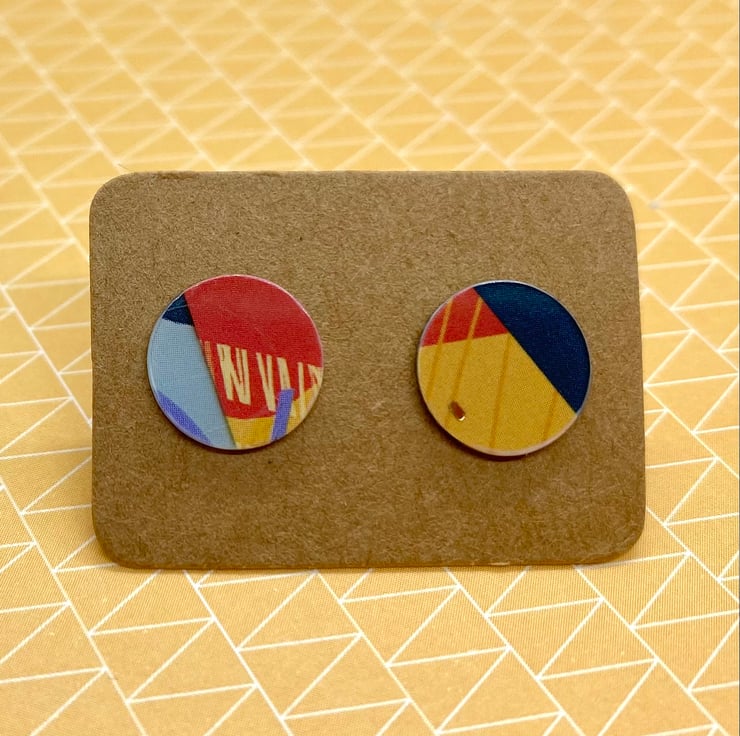 These vibrant 11mm disc studs have been made by recycling a plastic store gift card. Featuring a lively and modern graphic design in 3 colours, like mini, colourful works of art!