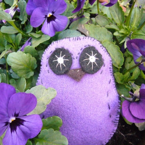 She is purple with a brown beak, hand cut and hand stitched from noodleBubble's own pattern so is really very unique.