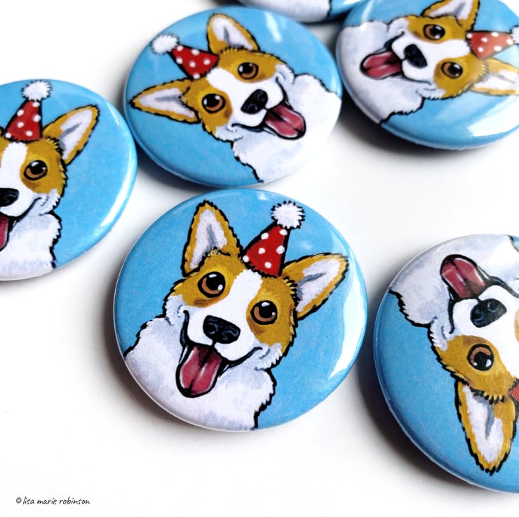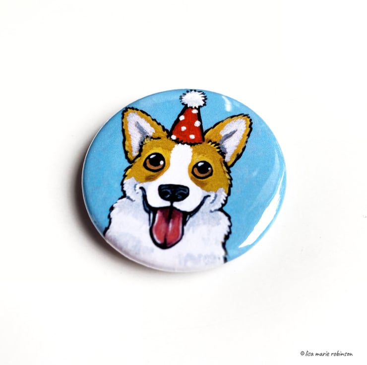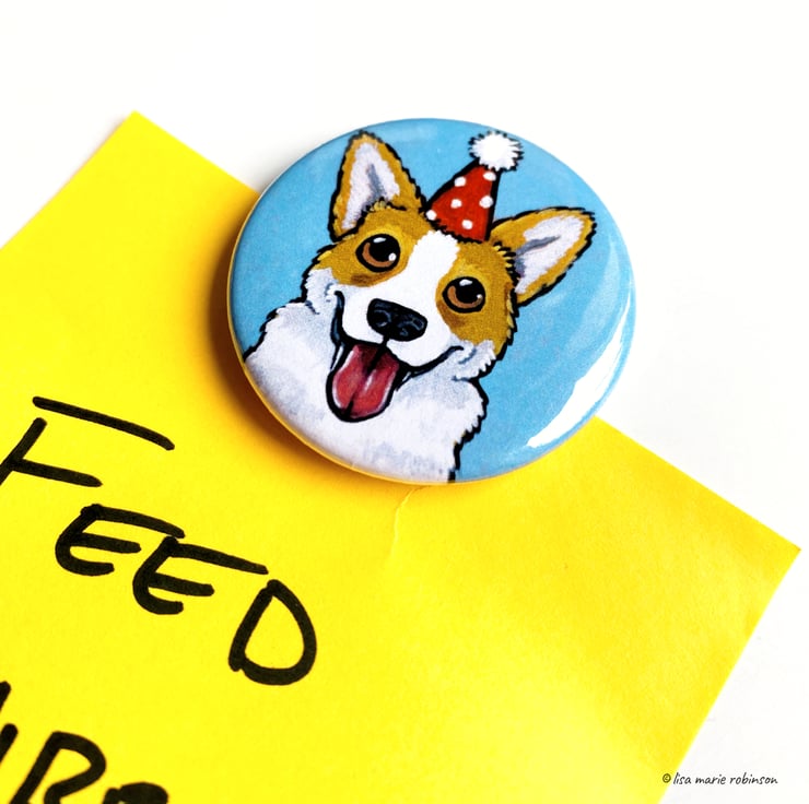 Cute little fridge magnet featuring a painting of a corgi with his tongue sticking out. This pup is super happy because it's his birthday, hence the party hat! Perfect little gift for corgi lovers.