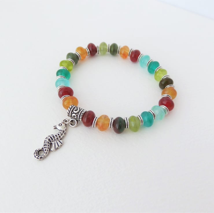 A lovely Tibetan silver sea horse is the feature on this one, I've tried to go with colours from deeper in the ocean, sea weed, coral, sand and the habitat of a seahorse.