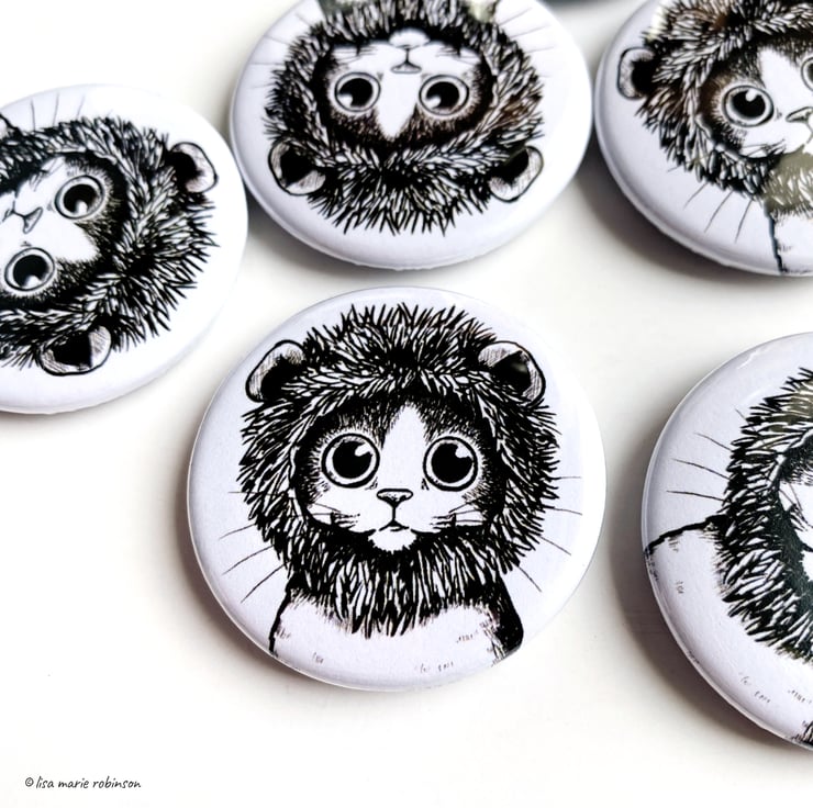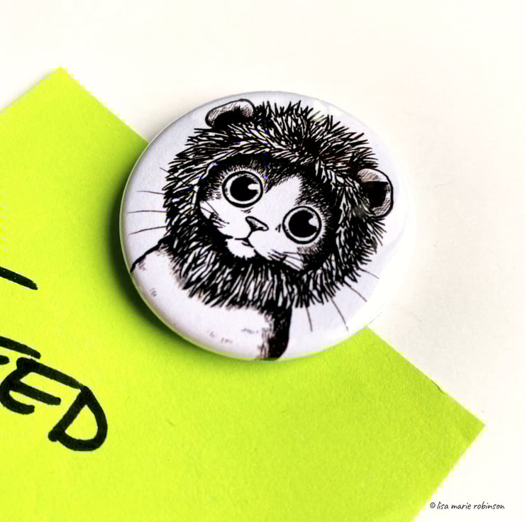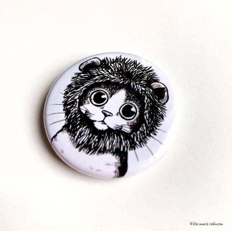 Cute little fridge magnet featuring a drawing of a cat wearing a lion mane hood. This kitty is more purr than roar! Perfect little gift for the cat lover in your life.