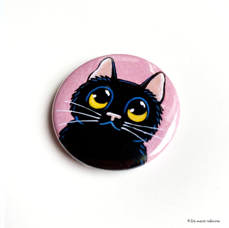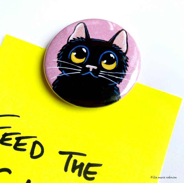 Cute little fridge magnet featuring a painting of a black cat against a pink background. Just look at his little pink nose! Perfect little gift for the cat lover in your life.