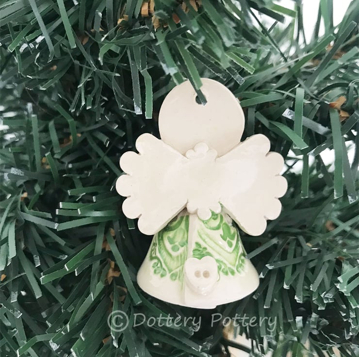 This tiny little angel is made from white earthenware clay. She has a little cream dress and a cute little button at the back. She can hang from the Christmas tree or be a free standing ornament. She measures 5cm high x 4cm wide (the last photo is to show the button)