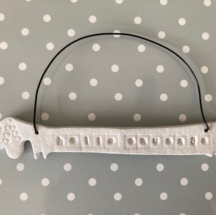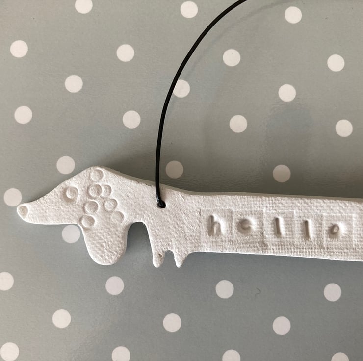 Sausage dog hanger. This cute sausage dog is made from white air dry clay and painted with a acrylic paint to seal.