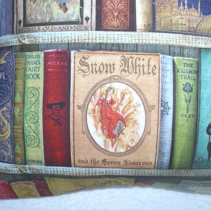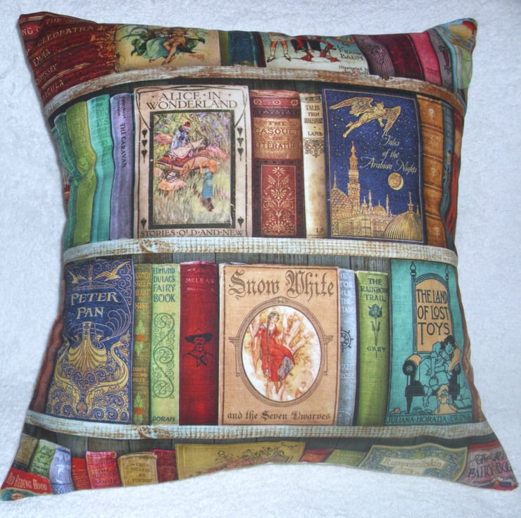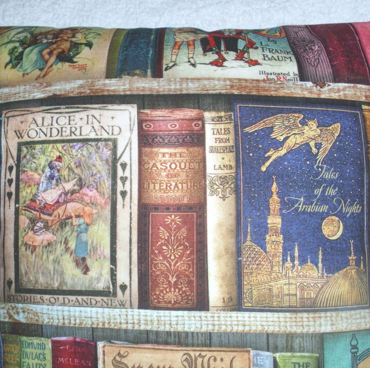Books in the bookcase cushion with book fronts and spines of books including Thumbelina , Peter Pan, Alice in wonderland, Snow White, The Land of Lost Boys and many others with illustrated covers, all on a pale blue bookcase background. Very unusual design.