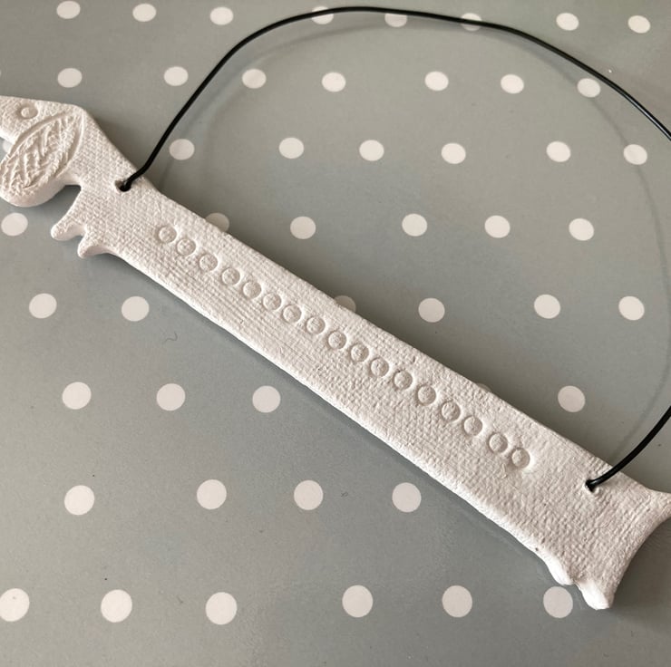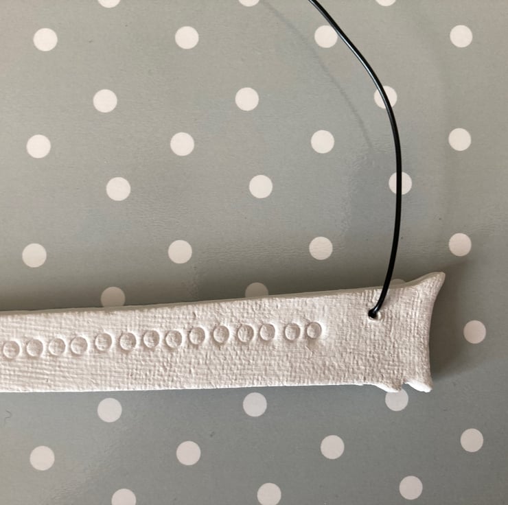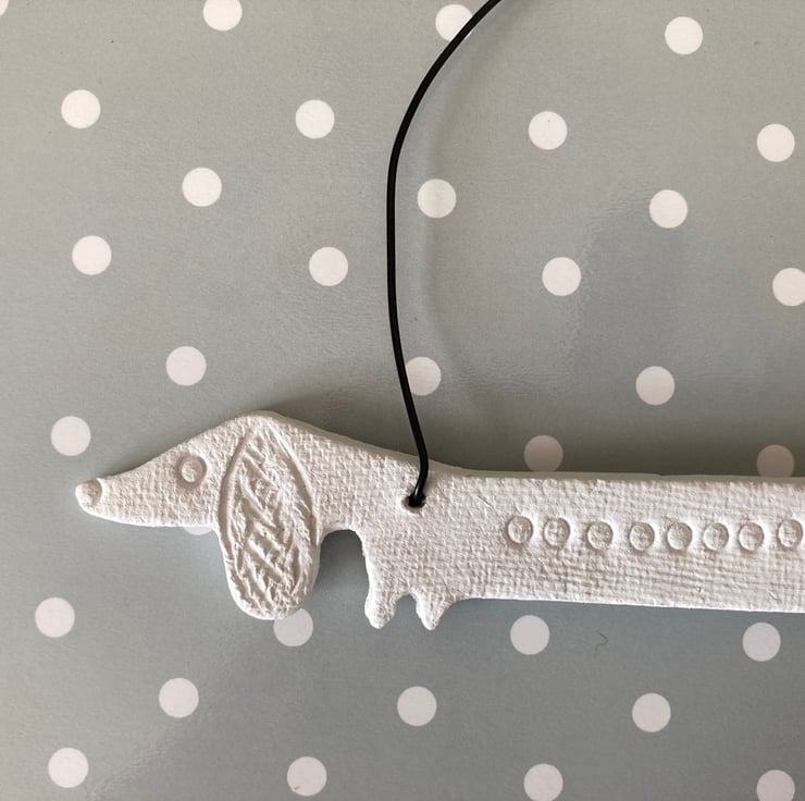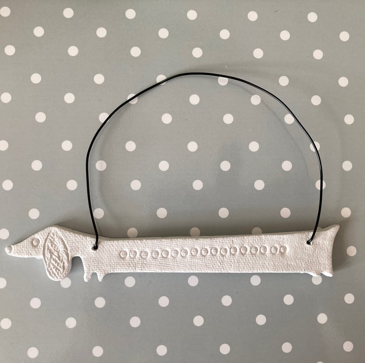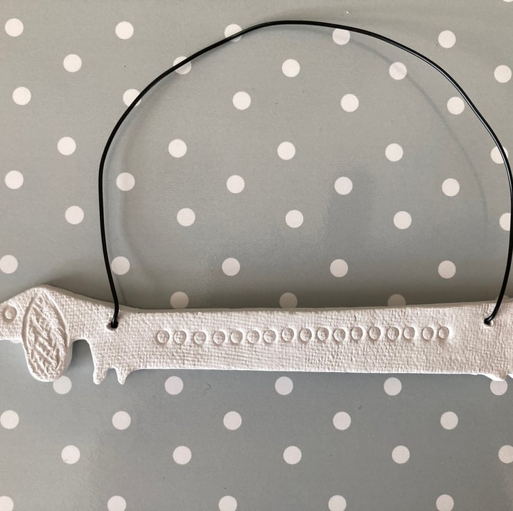 Sausage dog hanger. This cute sausage dog is made from white air dry clay and painted with a acrylic paint to seal.