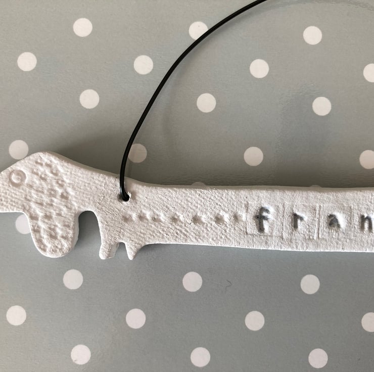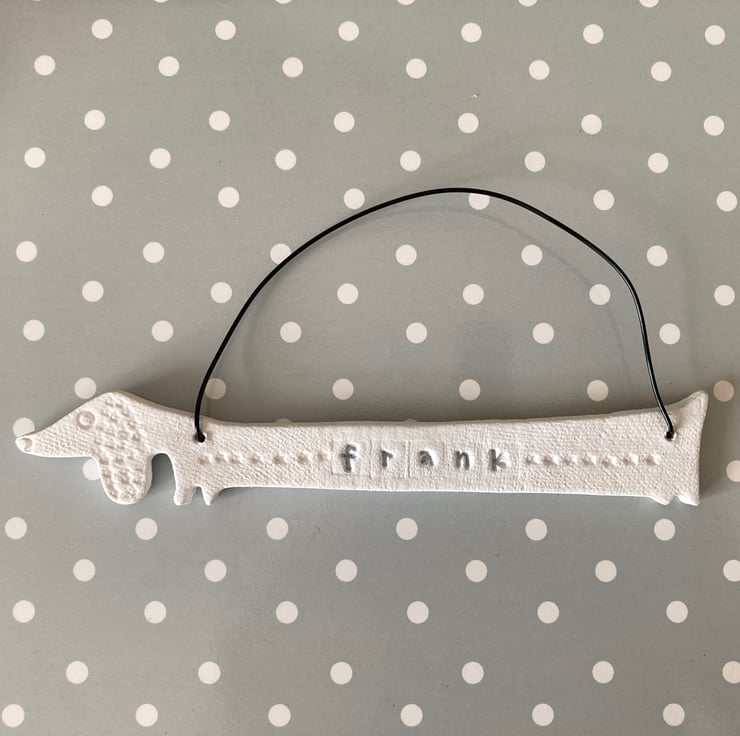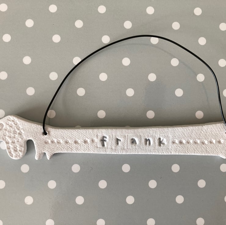 Sausage dog hanger. This cute sausage dog is made from white air dry clay and painted with a acrylic paint to seal.