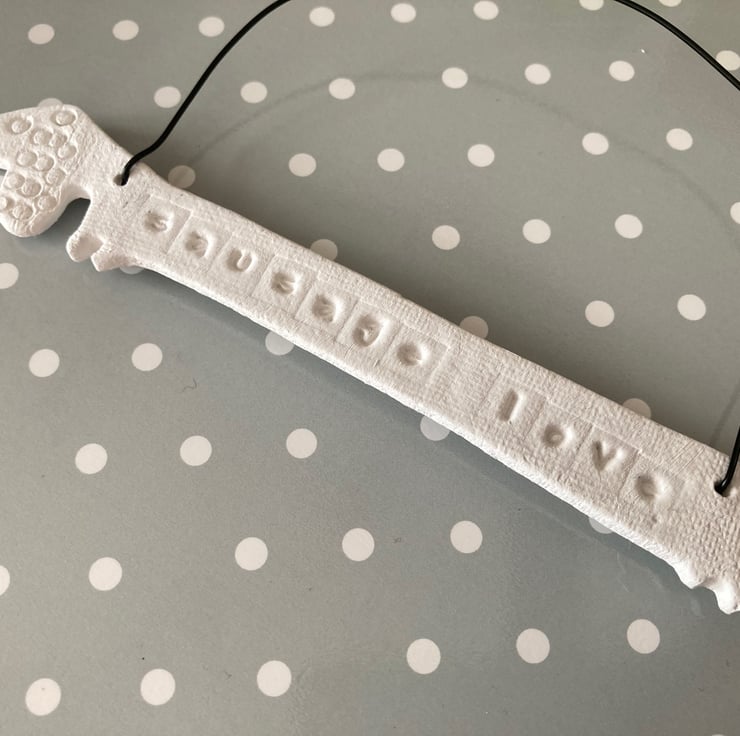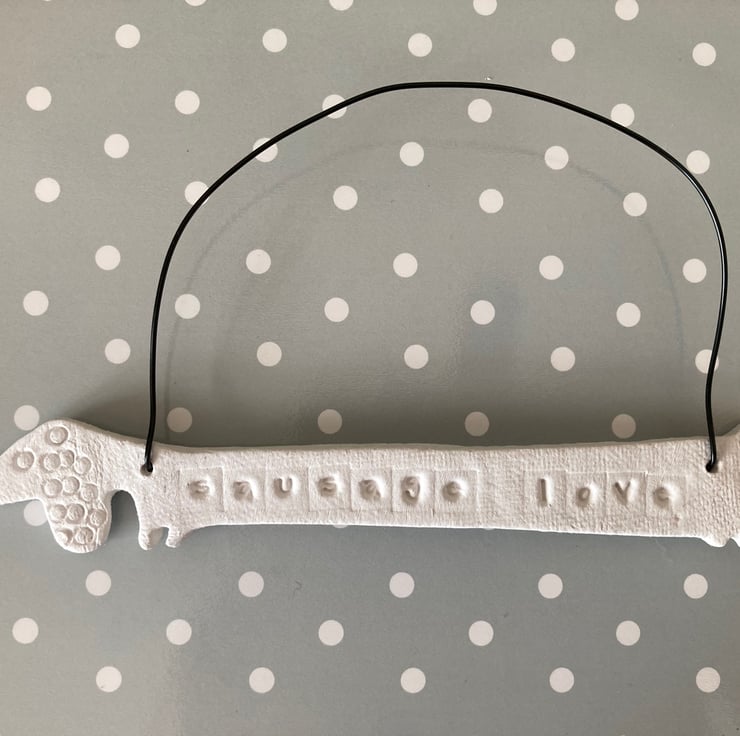 Sausage dog hanger. This cute sausage dog is made from white air dry clay and painted with a acrylic paint to seal.