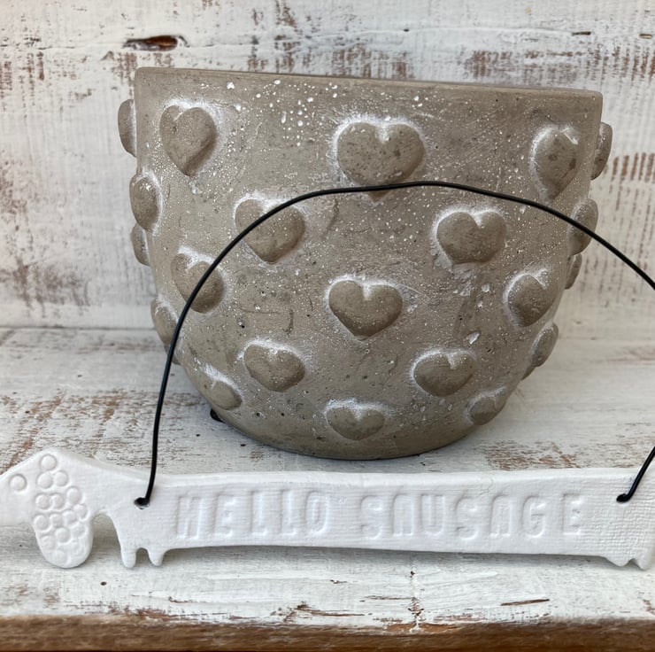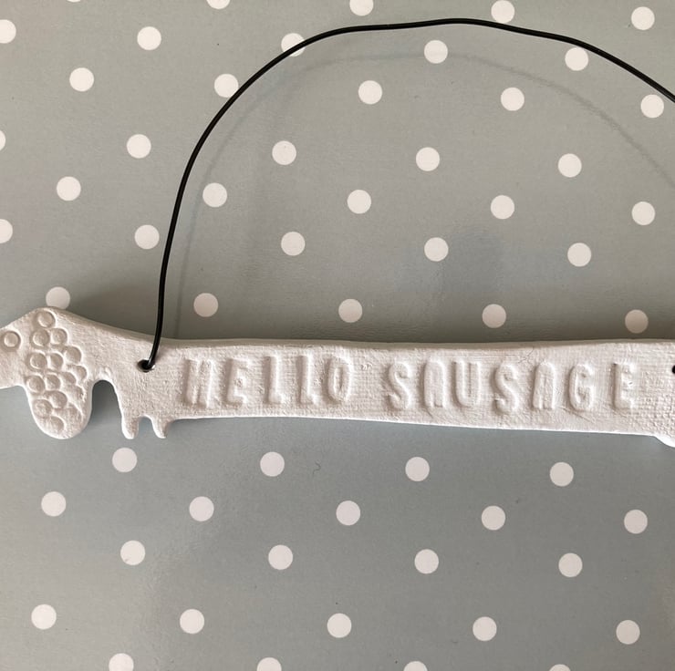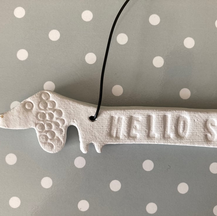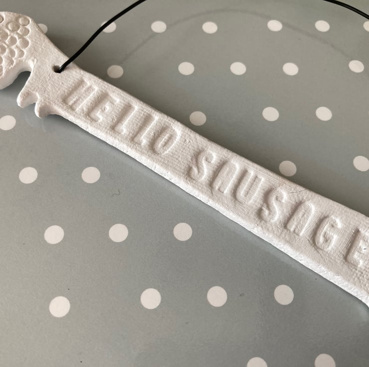 Sausage dog hanger. This cute sausage dog is made from white air dry clay and painted with a acrylic paint to seal.