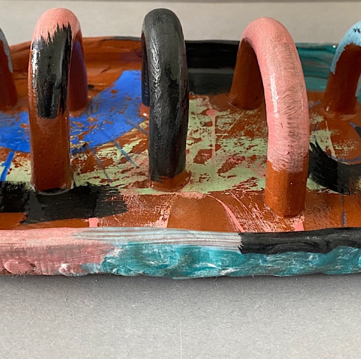 Hand made Terracotta toast rack. Shaped and formed by hand, with abstract pattern and colour marks. 5 donut sections are formed to store and present your morning slices. A bobbly bottom adds character, texture and skidding off the table avoidance!
