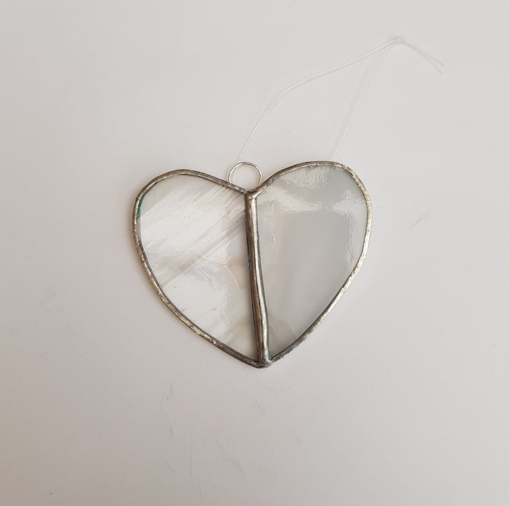 This small two piece heart is made using white/clear streaky glass and has a ring and invisible thread for hanging.