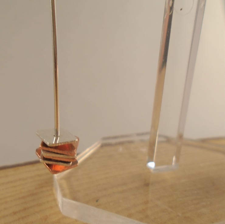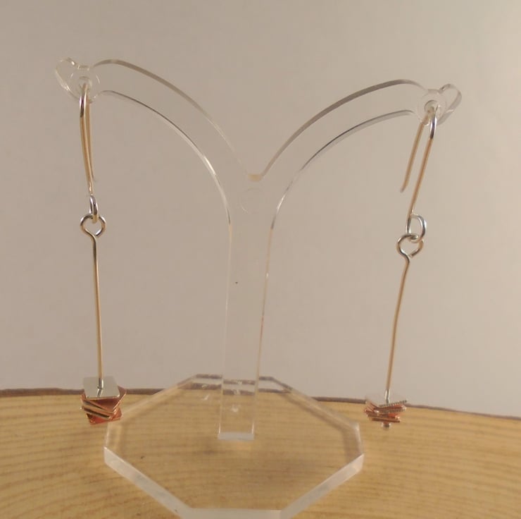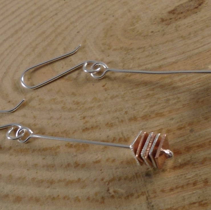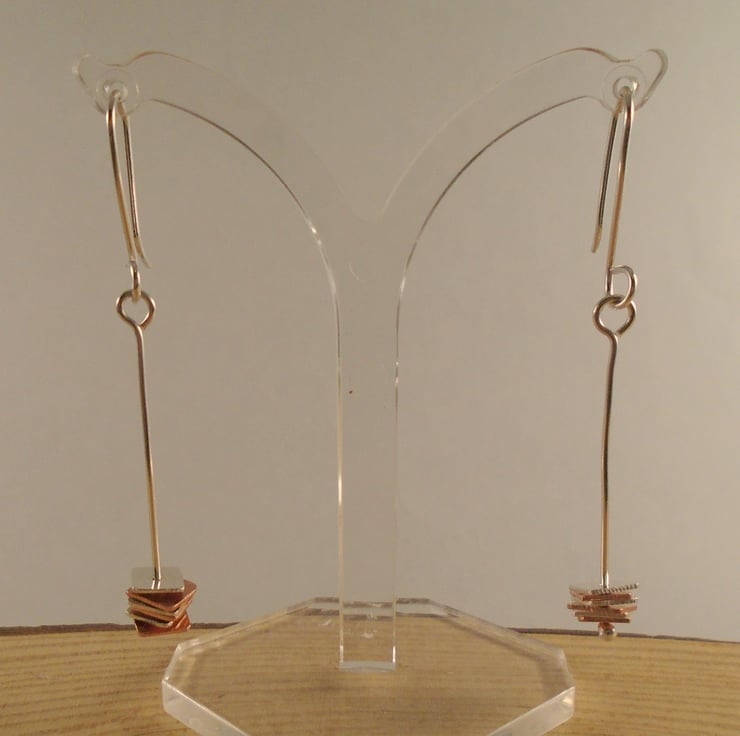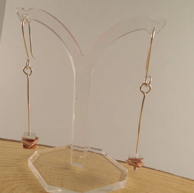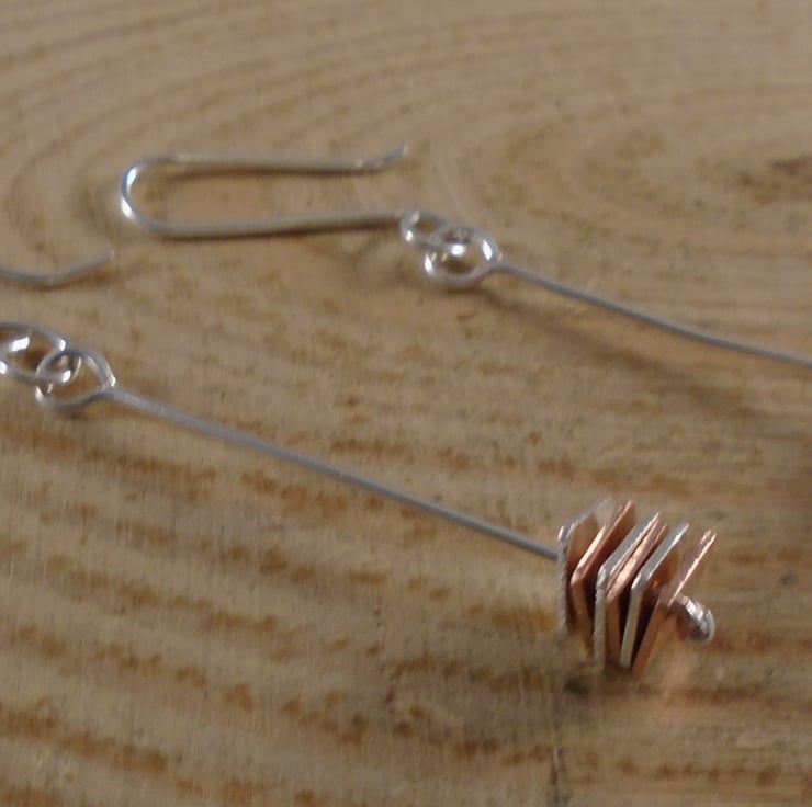 A quirky and unusual pair of earrings, hand made from sterling silver and copper. Small squares of sterling silver and copper have been hand pierced, and a hole drilled through the centre. They have then been threaded alternately onto silver wire, and then attached to a hand made sterling silver ear wires.