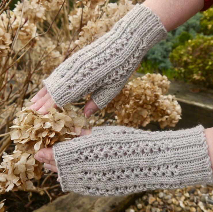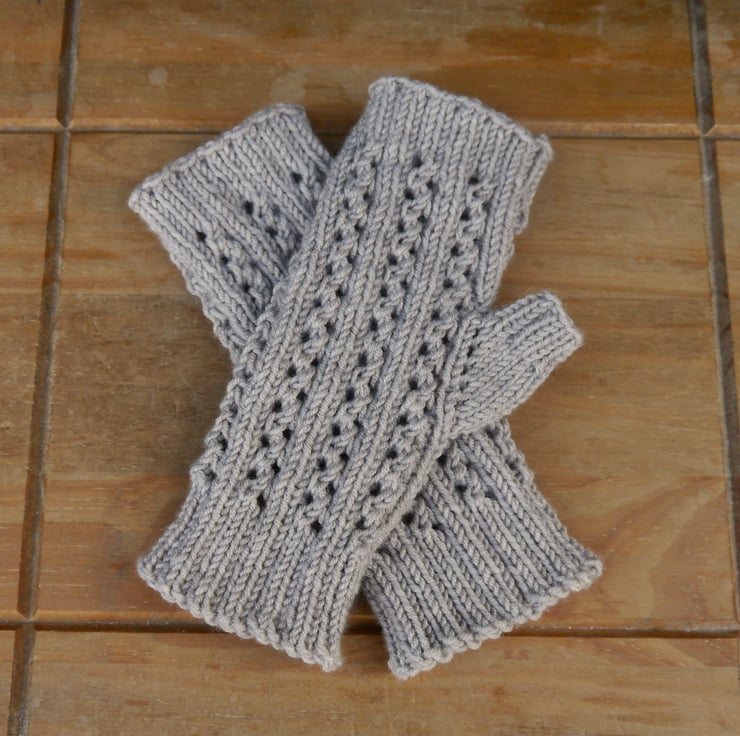 I have hand knitted these using a lovely 100% merino wool yarn in a lovely warm grey colour. They are knitted in the round so there are no seams. They have a lacy ribbed stitch which gives a lovely stretchy fit and there is also a place to keep your thumb warm too.