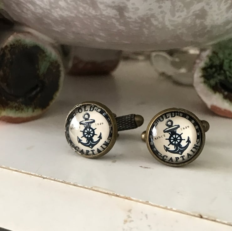 Blue Anchor 12mm Glass Cabochons with the words "Old Captain " .