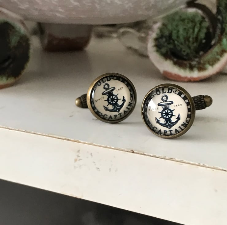 Blue Anchor 12mm Glass Cabochons with the words "Old Captain " .