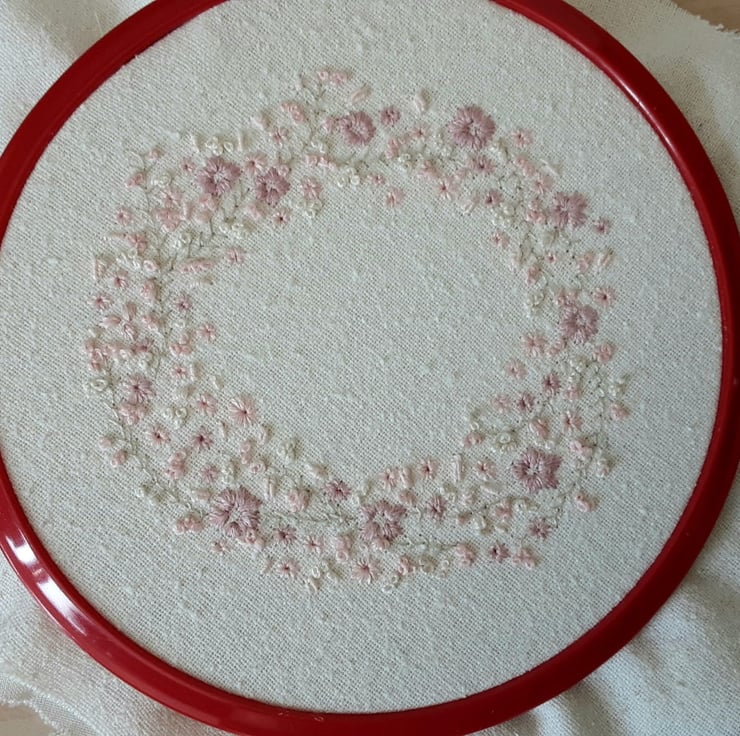 Delicate hand embroidery in pale pinks and naturals onto natural silk noil fabric. I have hand embroidered flowers and blossom in very soft pinks using 1 and 2 strands from 6 stranded dmc threads.