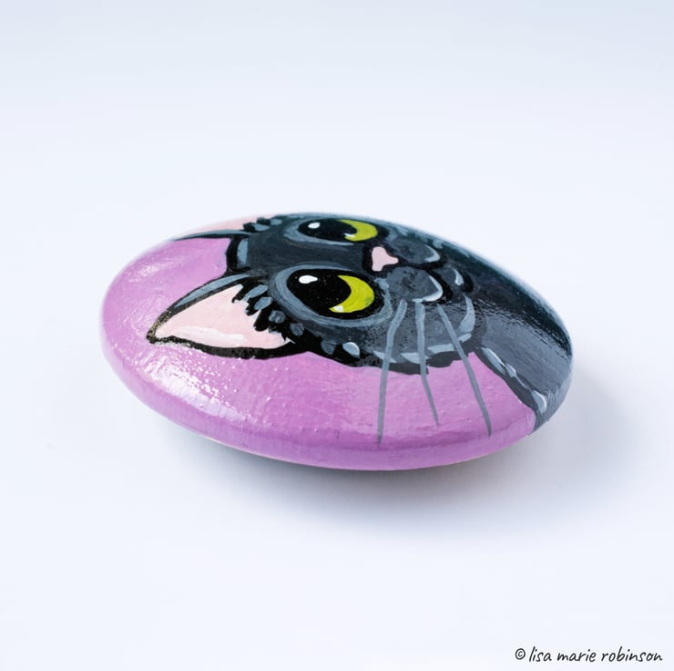 Hand painted wooden fridge magnet featuring a painting of a happy black cat, with green eyes, on a light pink background!