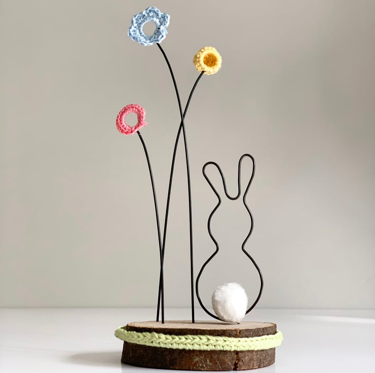 A little bunny with a white pom-pom tail sits in a wood slice next to three wire flowers with crocheted flower heads. It would make a perfect Easter decoration.