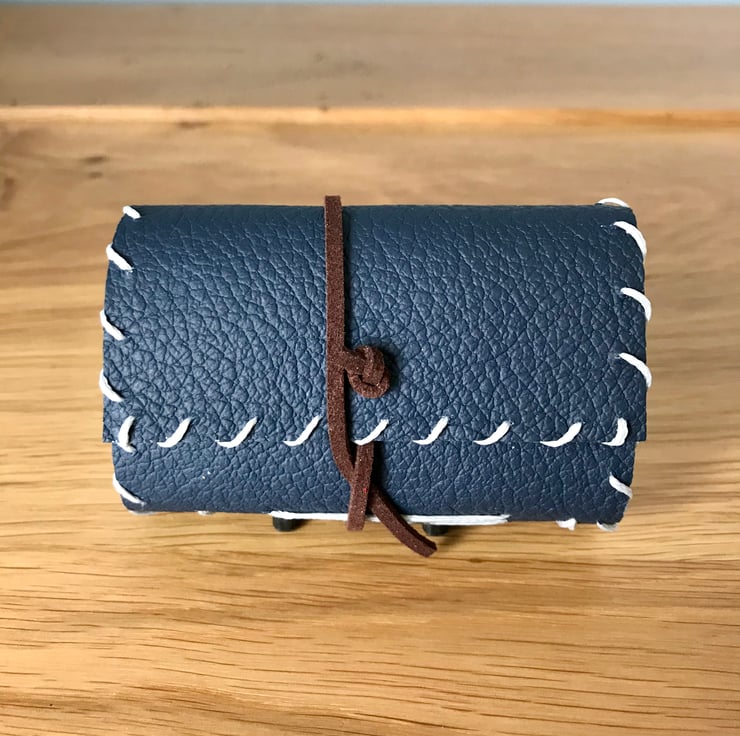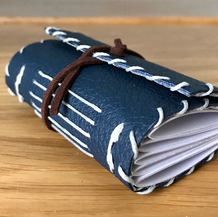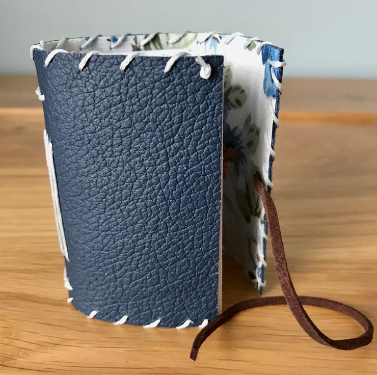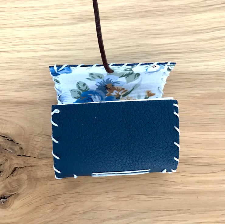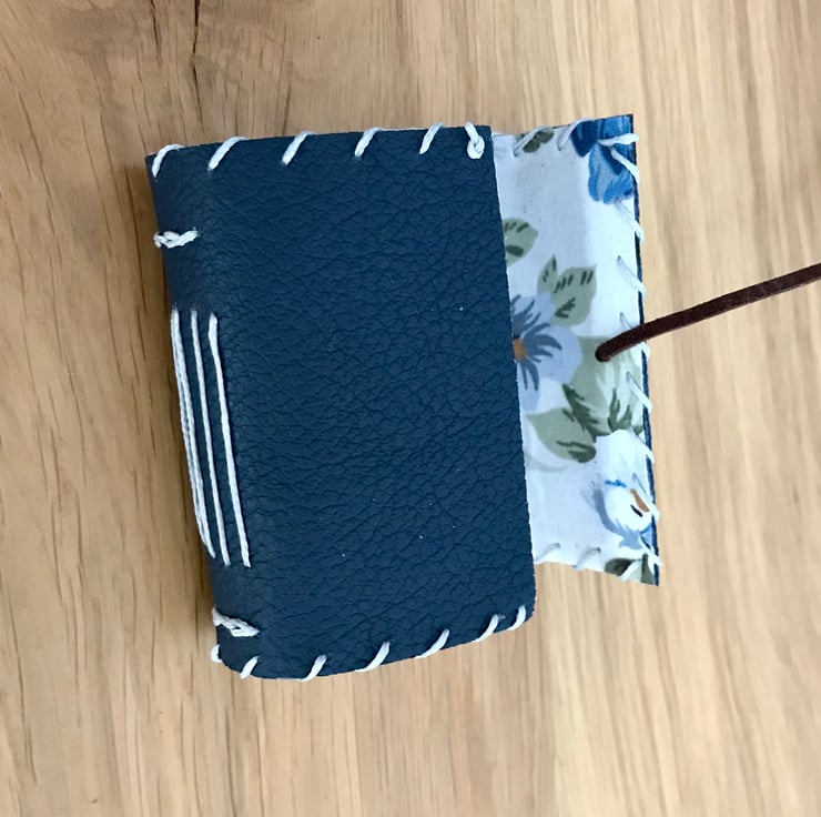 A gorgeous navy blue leather with a pretty white, green and blue floral fabric lining. The notebook is hand stitched around the edge with a white coloured thread and contains 120 sheets of plain white paper which are then hand stitched to the leather in 5 signatures. The notebook is fastened with a dark coloured suede cord tied loosely at the front.