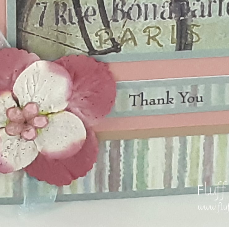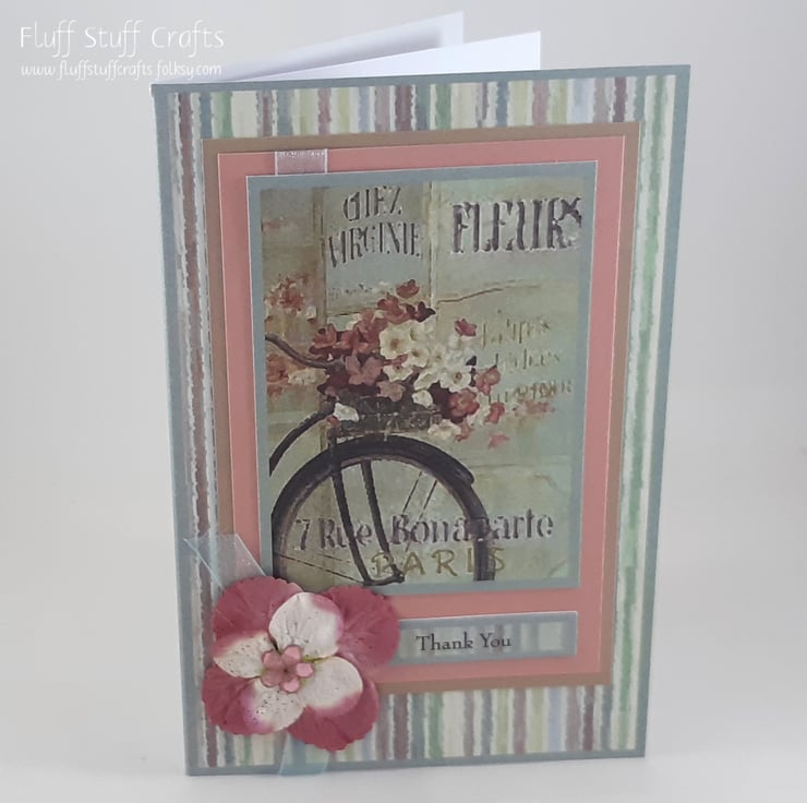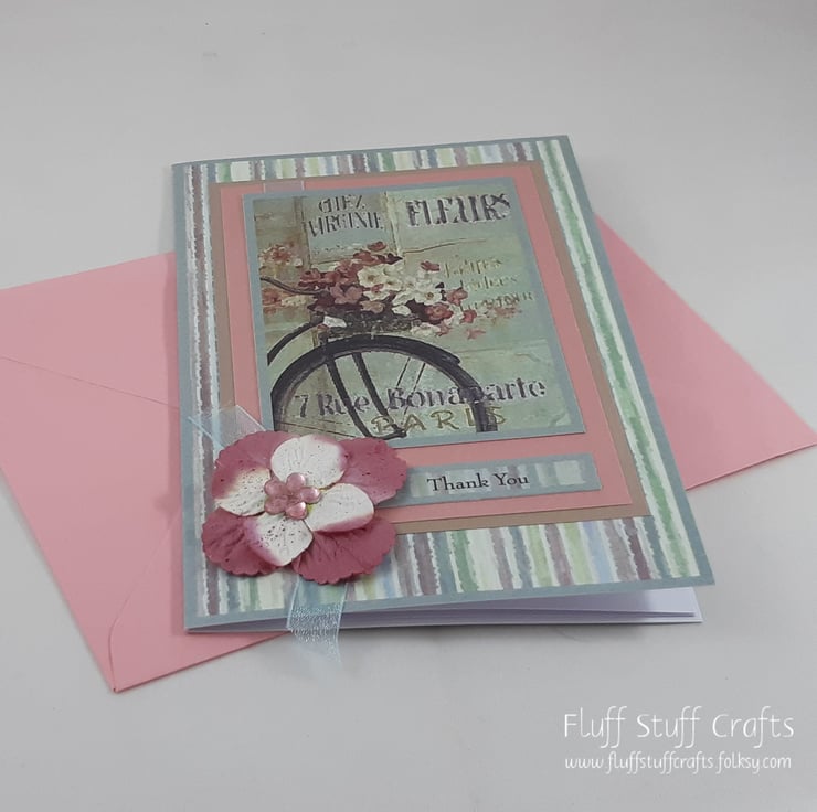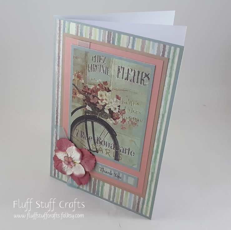 A6 thank you card featuring an image of a bicycle with basket full of flowers outside a Parisian flower shop. The image is mounted on pink and beige card, over a multi coloured, striped card blank. The sentiment reads: 'Thank You' and the card is embellished with paper flowers with an acrylic flower centre.