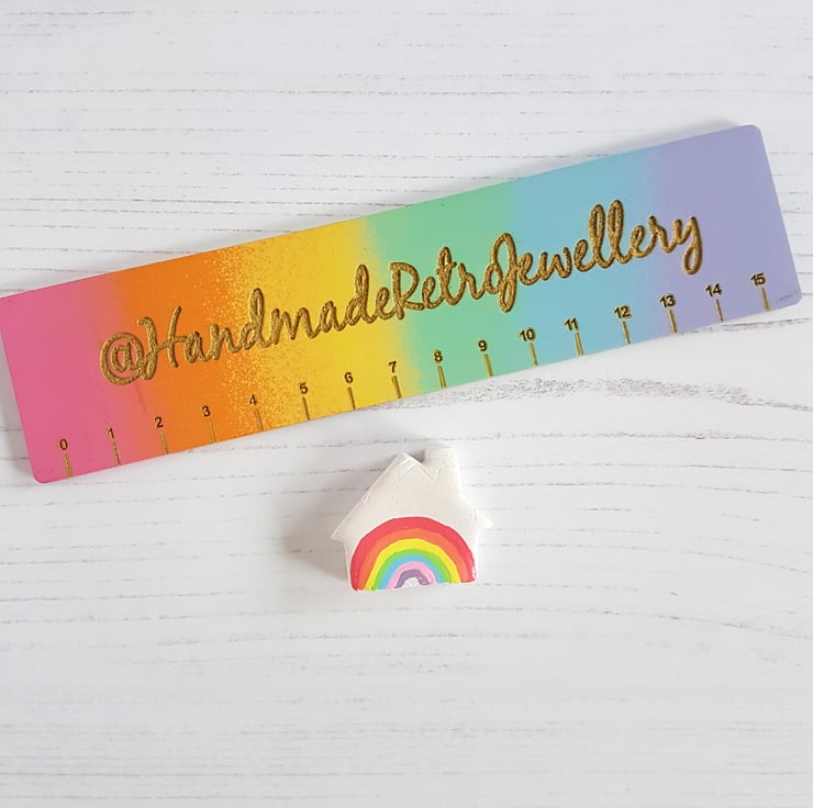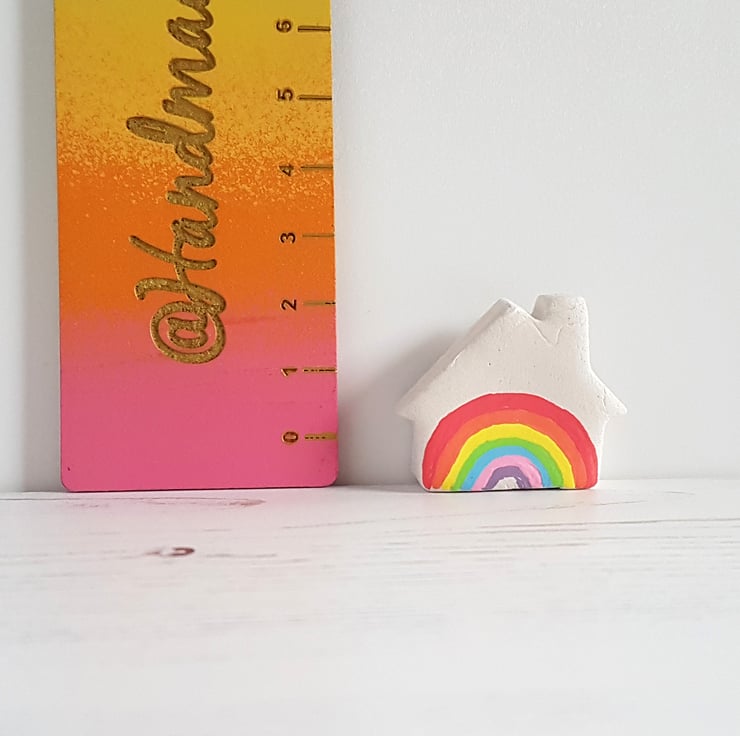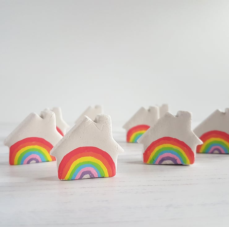These cute little houses with rainbows ornaments are made from air dry clay, then finished off using a dryer, and finally hand painted using acrylic paint. They are then sealed with a varnish to protect.