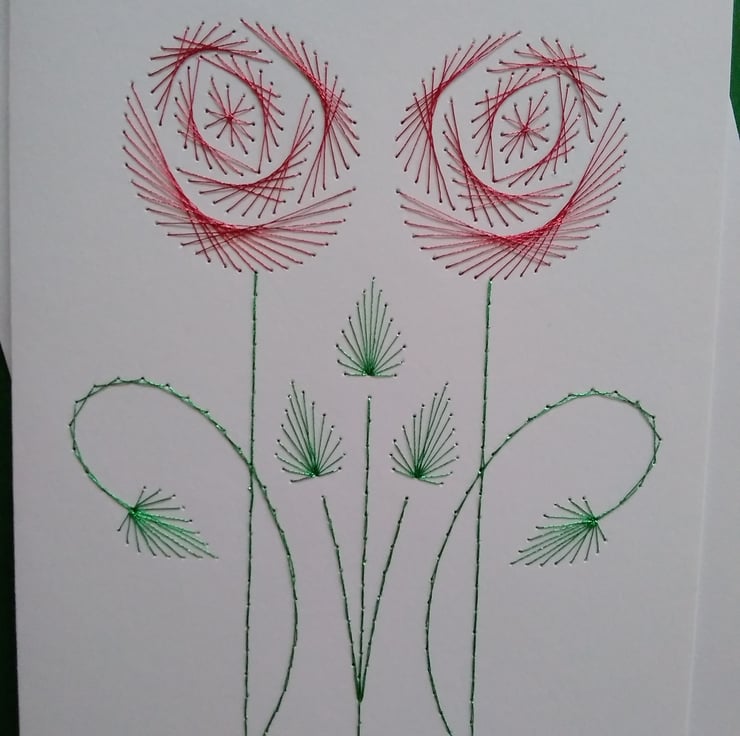 A lovely birthday card featuring two Renni Mackintosh inspired roses, hand embroidered in red, green and gold metallic thread on a white card. The green insert has been left blank for your own message.