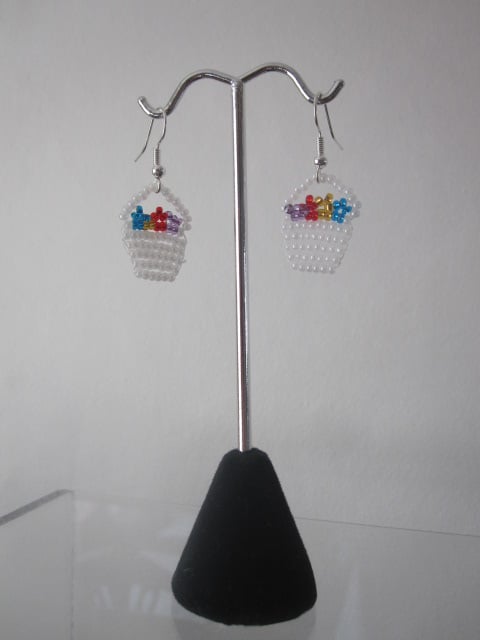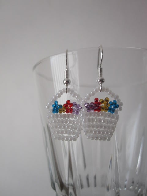 A pair of beadwork earrings in the theme of a basket filled with eggs made with Czech glass seed beads. They have a drop of approx. 2cm and are approx. 1.6cm wide. The earring findings are silver plated.