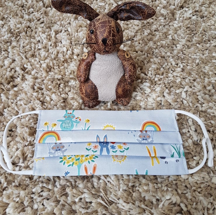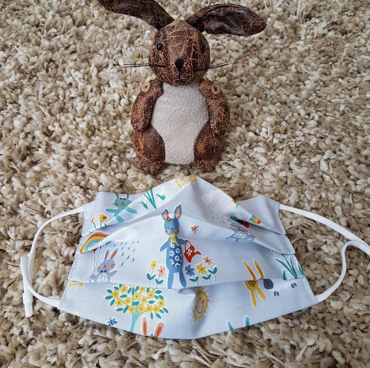 Adult face covering made from a bunny, sunshine and sheep print on a pale cotton. The face mask is made with 2 layers of cotton forming an inner pocket for a filter (not included) and is fastened over the ears with 2 loops of elastic and a toggle adjuster.