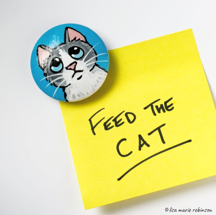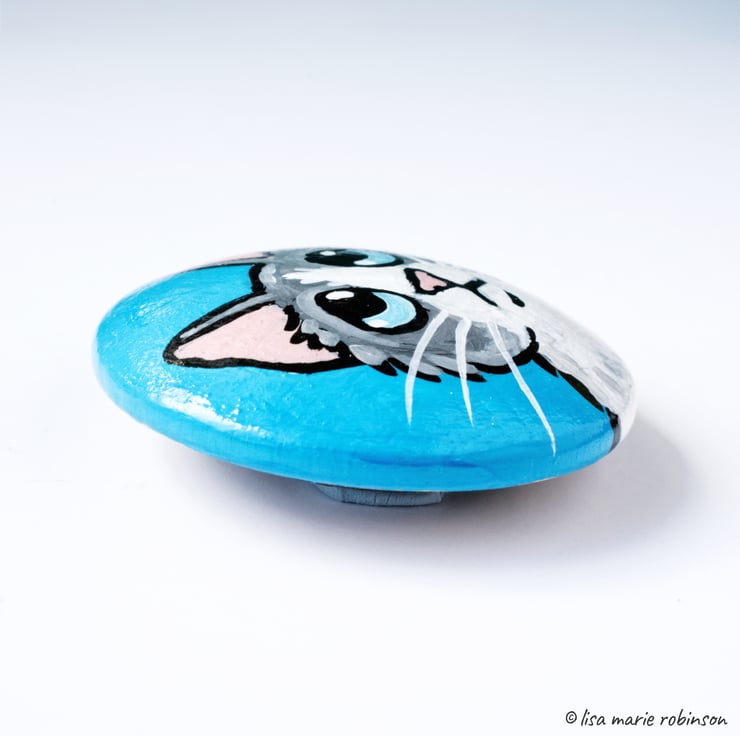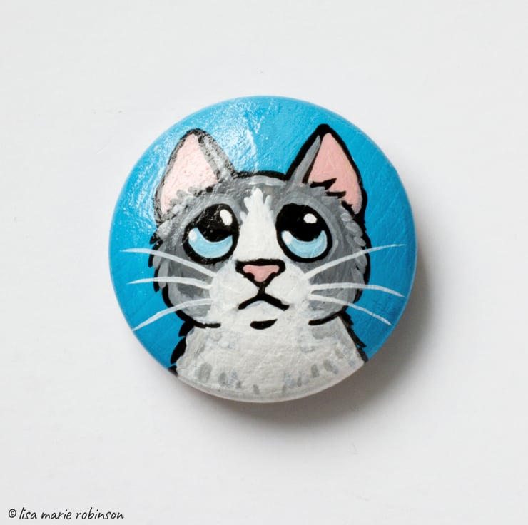 Cute hand painted wooden fridge magnet featuring a painting of a grey and white cat with big blue eyes.