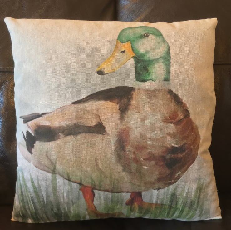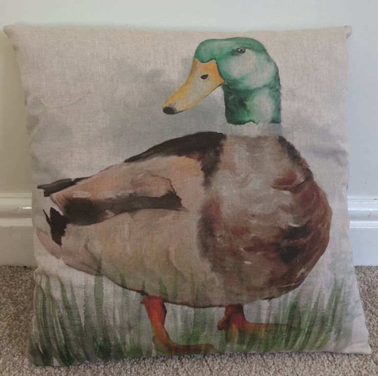 A medium sized cushion made from a cotton rich linen featuring a handsome mallard duck.