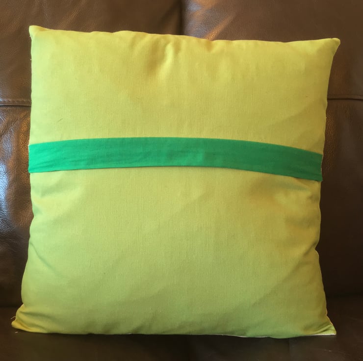 The back of the cushion is made from a lime green cotton canvas. It has a covered zip to allow for easy insertion of a cushion pad. The zip is covered in a dark green cotton.