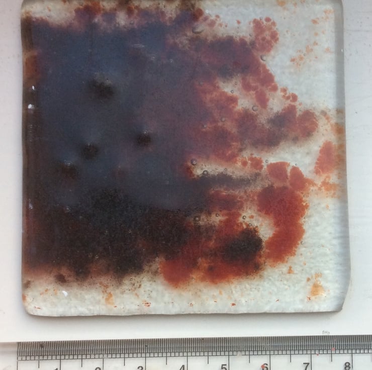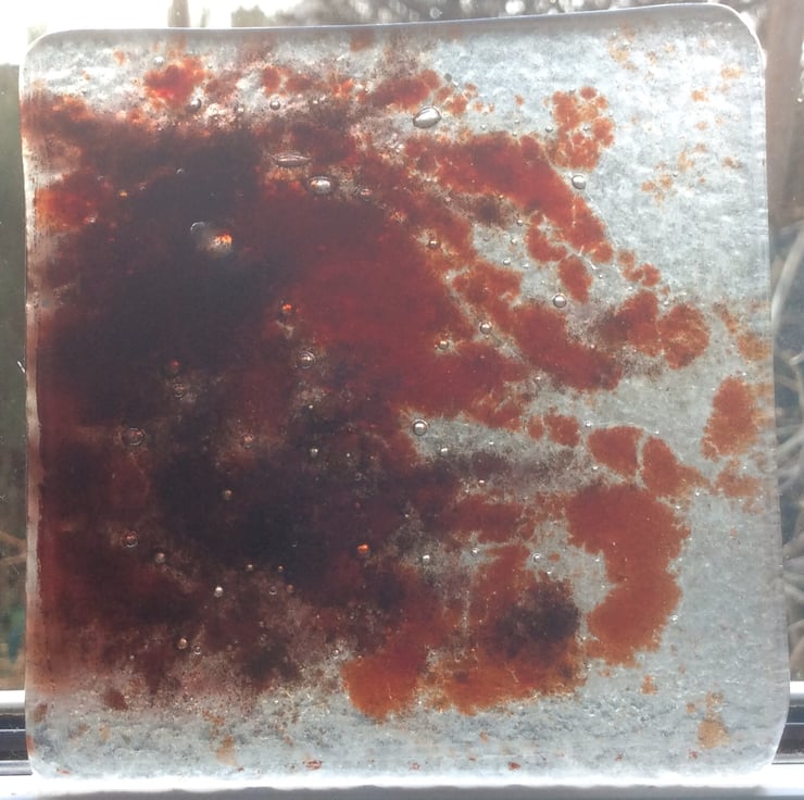This beautiful fused glass uniquely and individually designed tile is made with glass marbling techniques and adds a bit of style to any table as a coaster and can also be a wall tile or attractive suncatcher. It is sized is 8 x 8 cm and has rubber feet on the bottom.