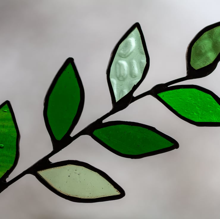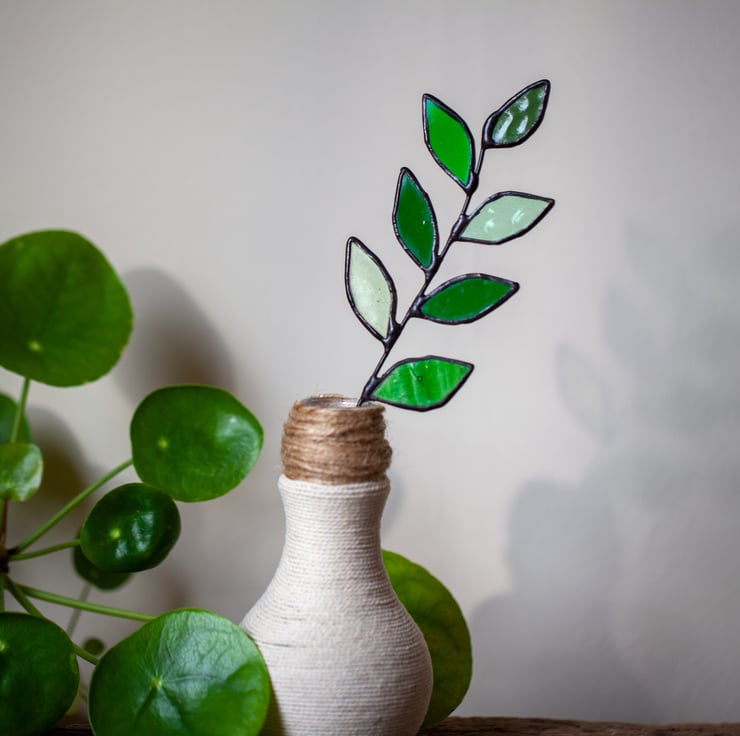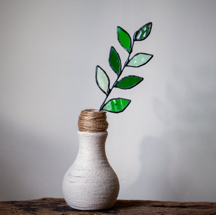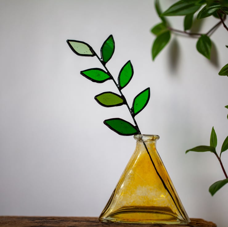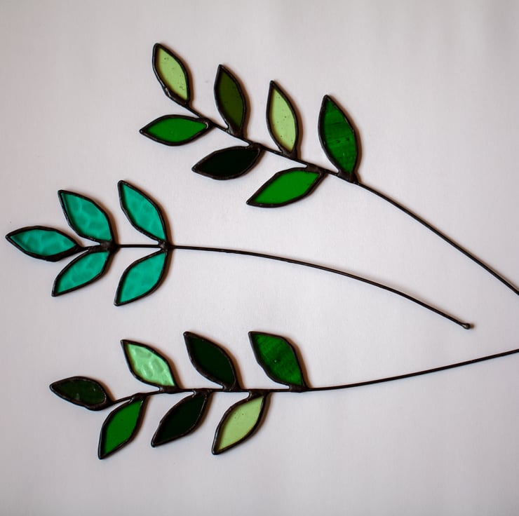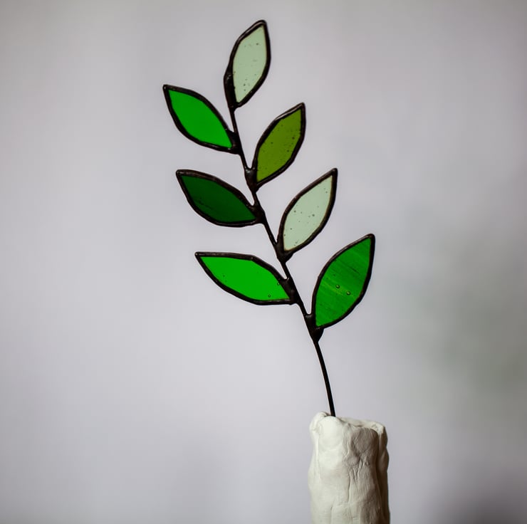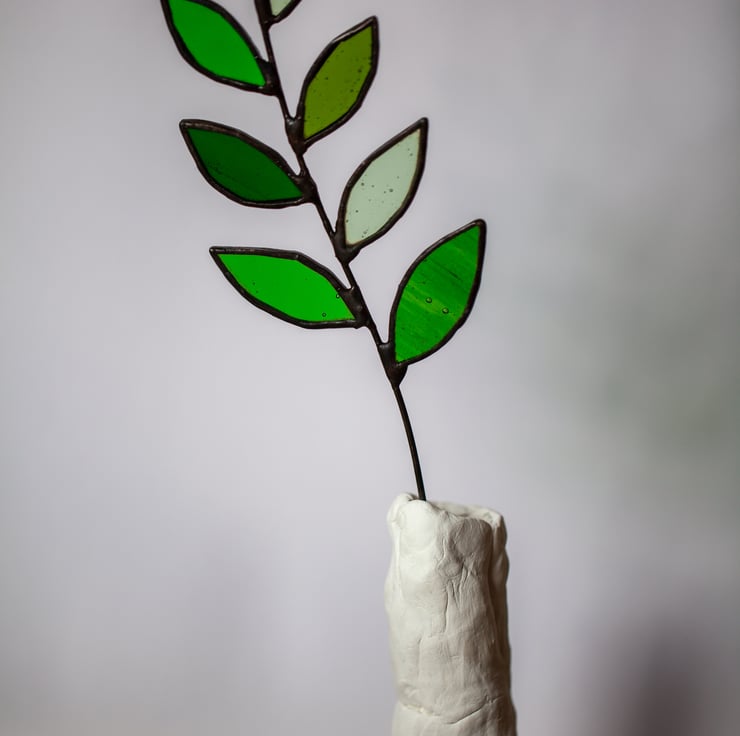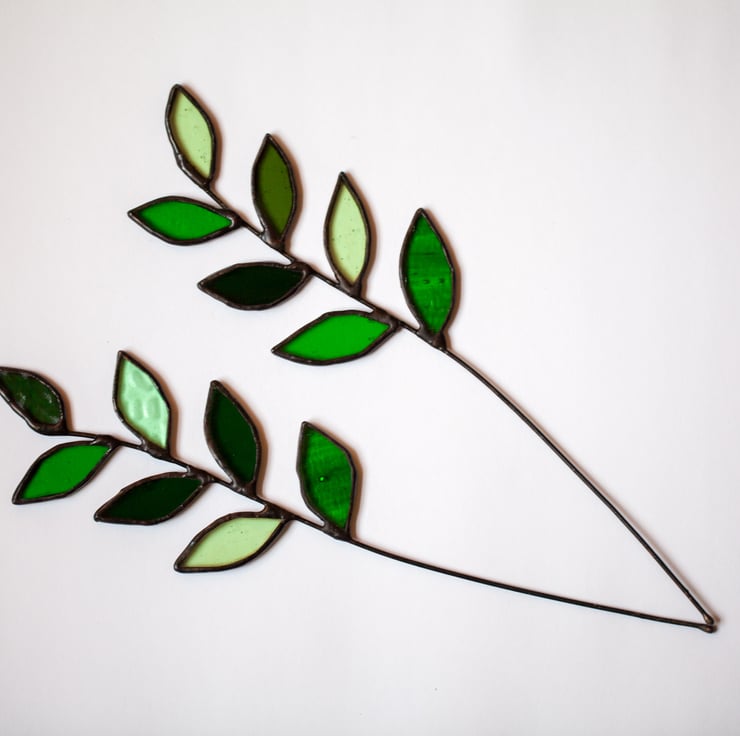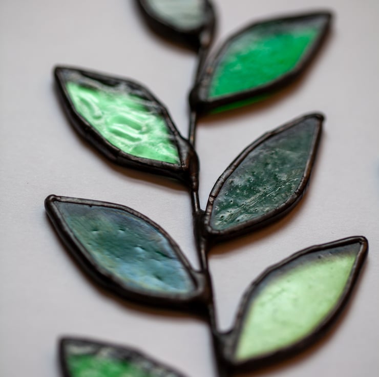 A delicate stained glass foliage has been hand made from different hues of green glass using the Tiffany technique. Some of the glass has lovely texture. Colours and their order on the vine may vary slightly from pictured ones. It is finished in black patina and polished. It looks lovely on the windowsill presented in a vase or may be used as a plant pot stake. Size varies too a little bit - no two leaves are alike! Length is between 24-26cm and leaf is 7cm wide approx.