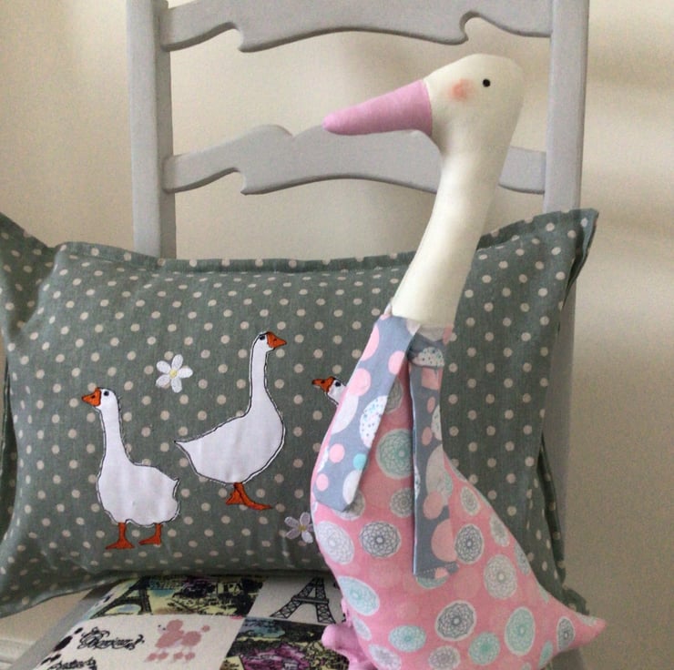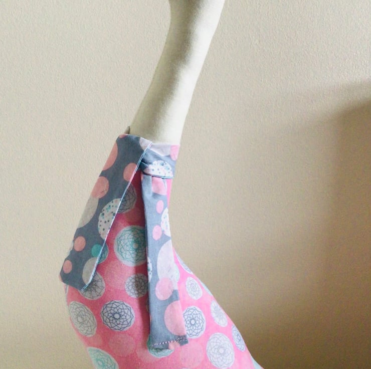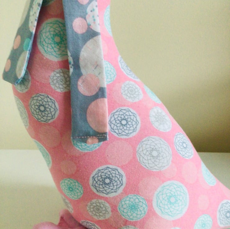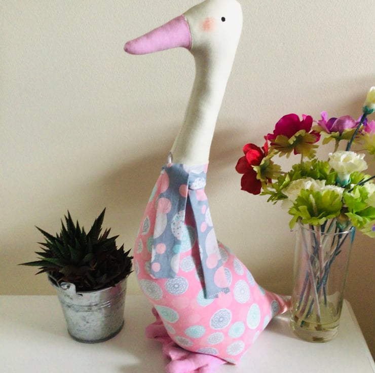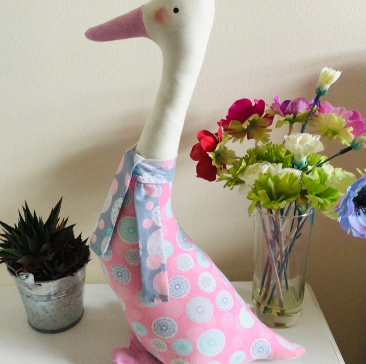 This is a lovely large Duck shelf sitter Ornament, in a pink fabric with circles and geometric shapes in-greys and pale blue.it has a cream neck,pink beak and webbed feet.