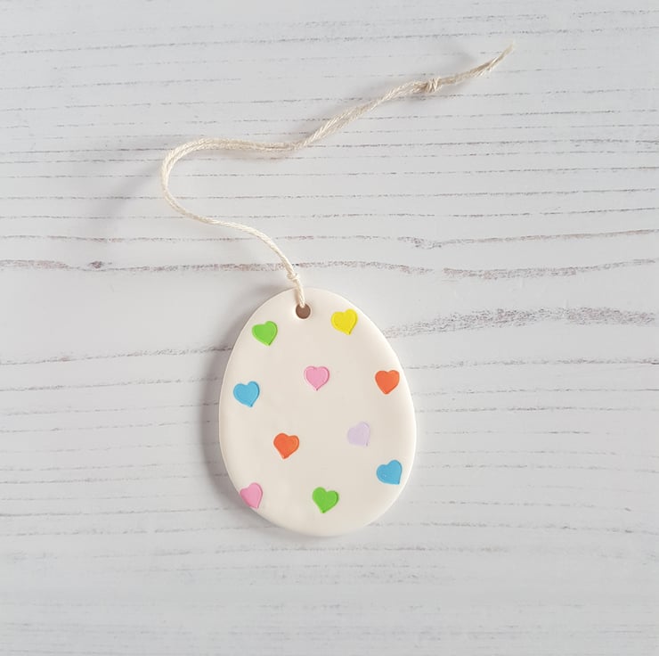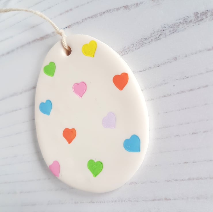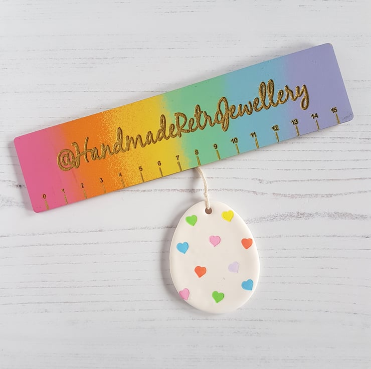 This Easter egg decoration plaque is made of polymer clay, with tiny little hearts hand stamped into the clay, then hand painted with pastel colour paints for definition!